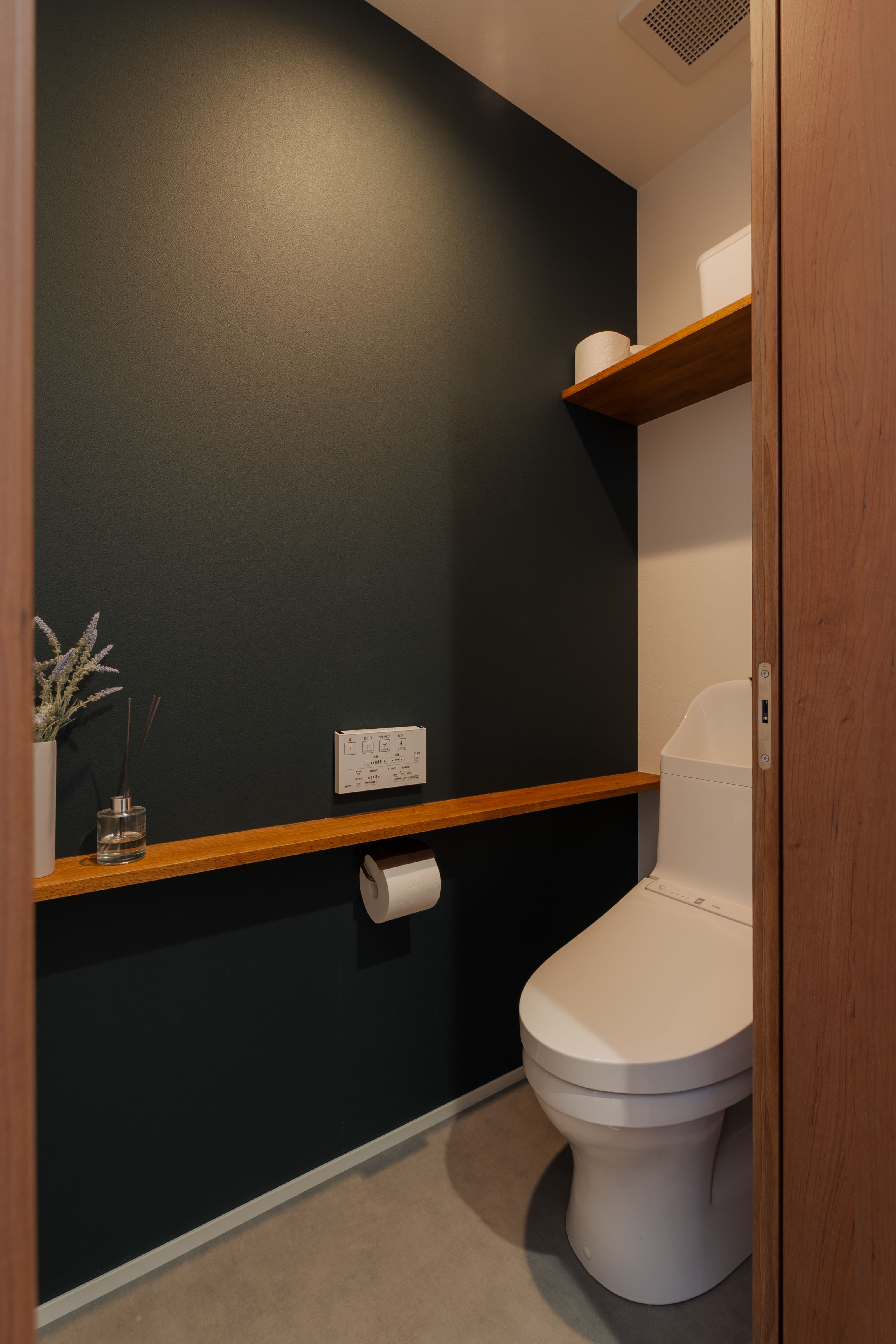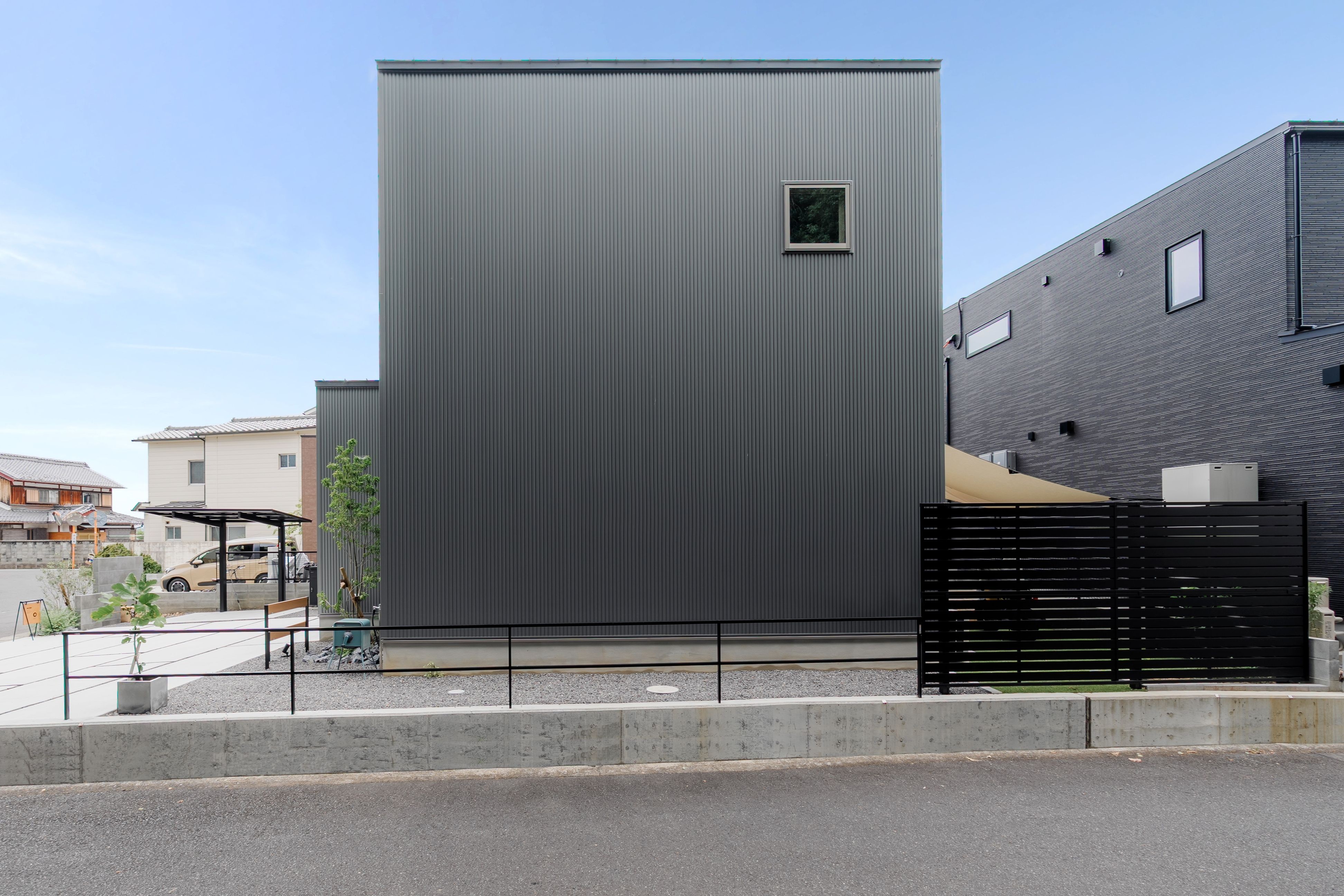 ガルバリウムと同色のグレー塗り壁が、さりげないアクセントに。