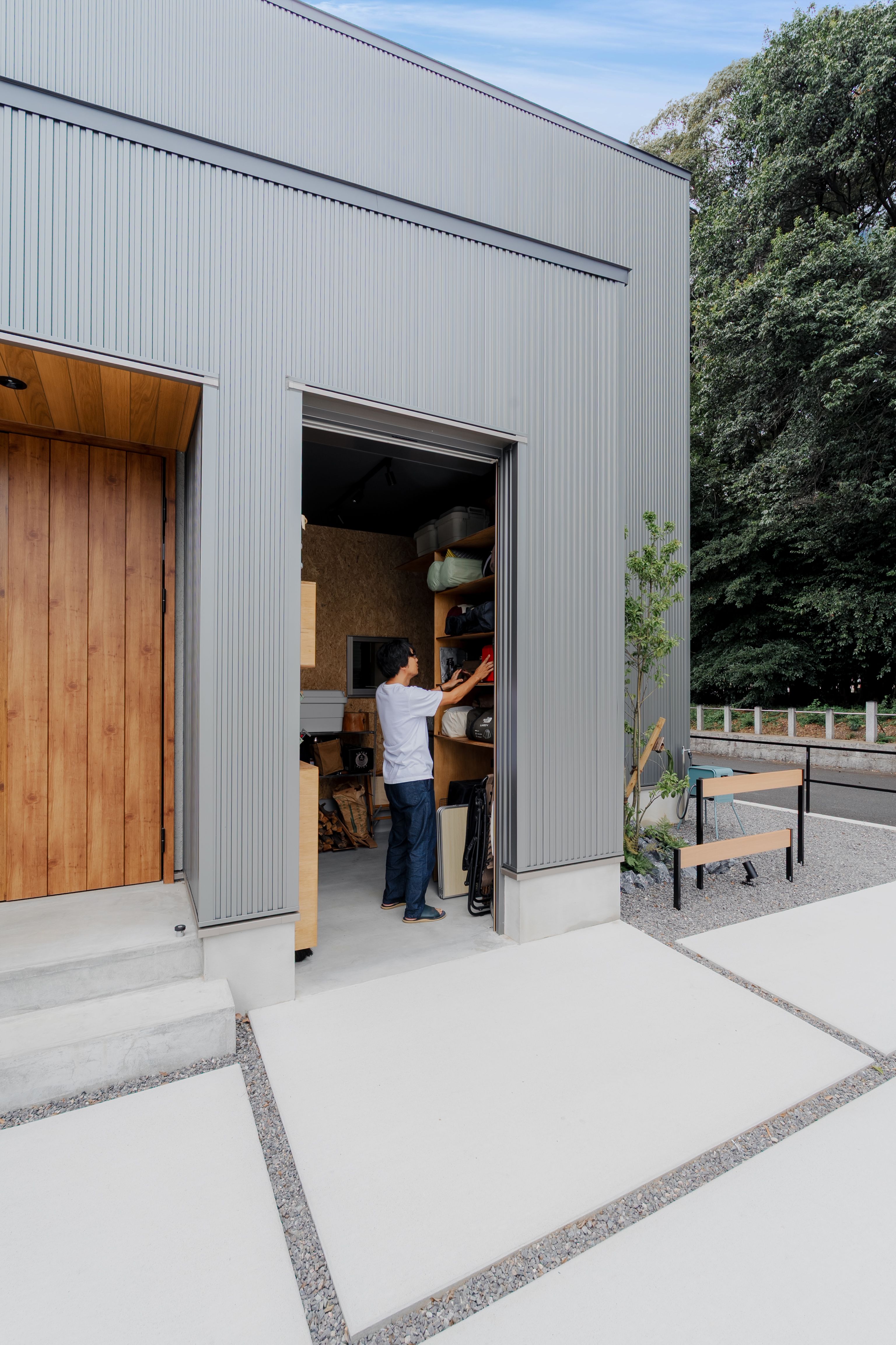 玄関脇に設けた、趣味を楽しむDIYガレージ。