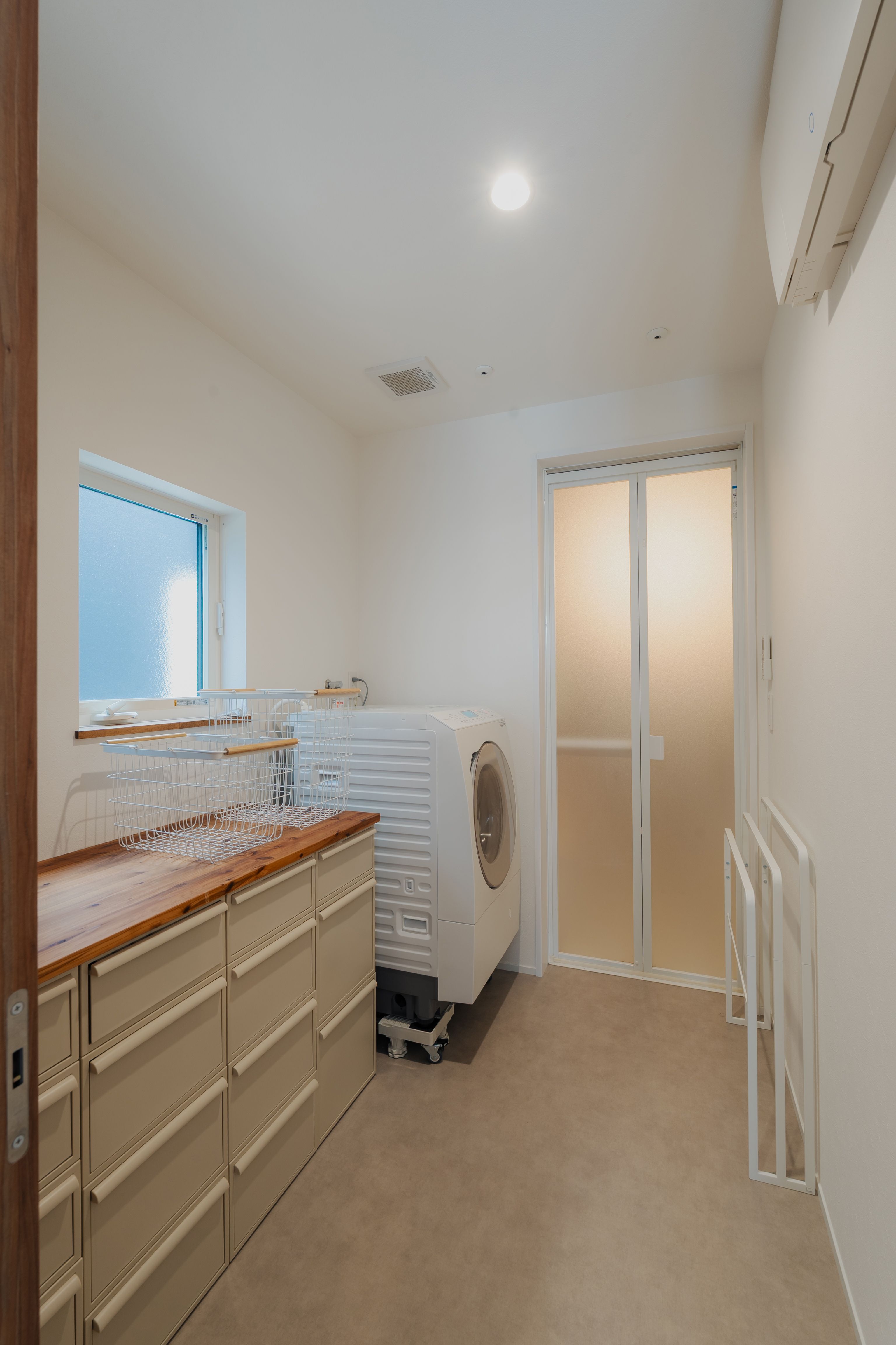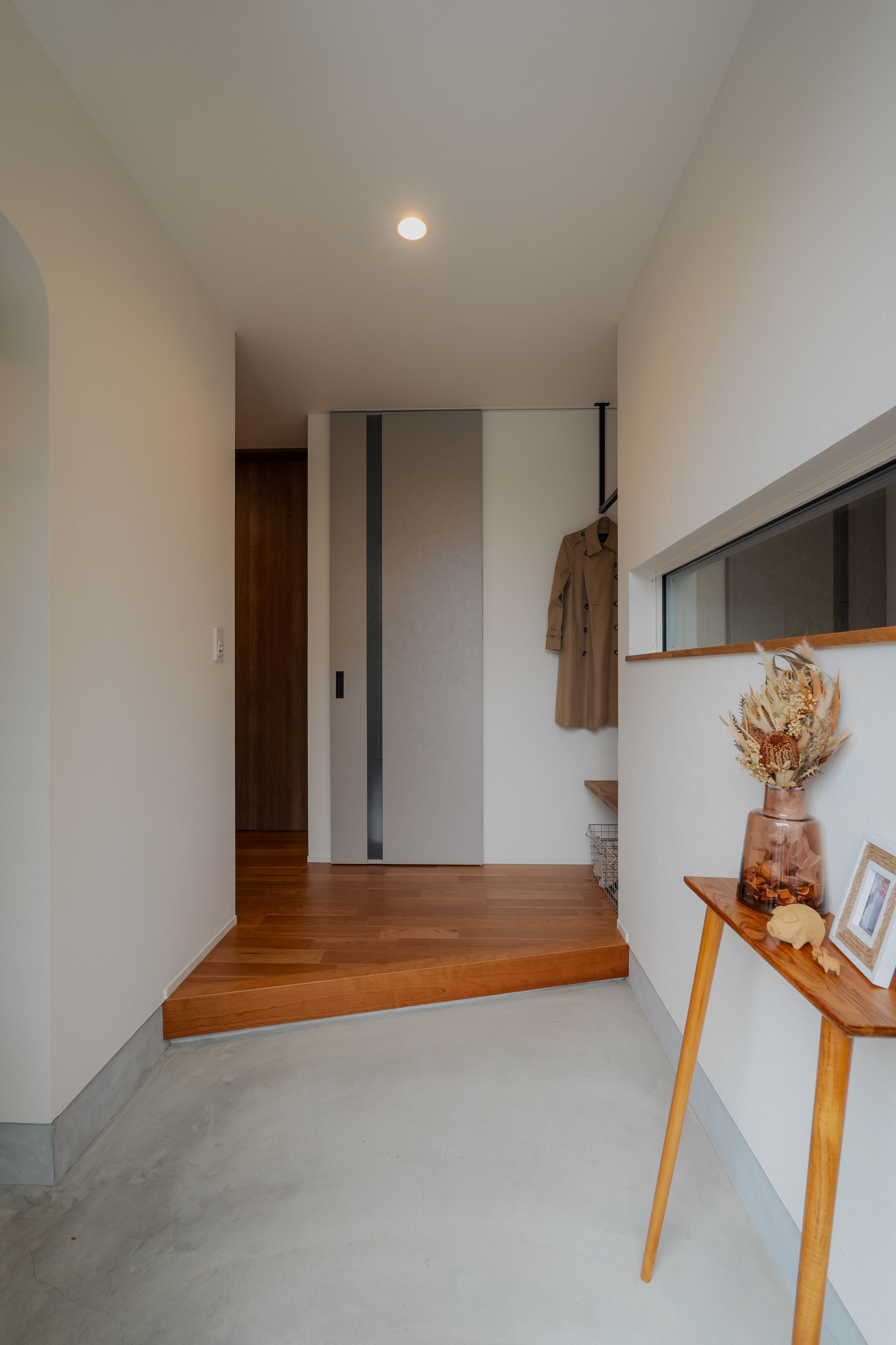 斜めに切り込んだ玄関框が奥行きを生み、DIYガレージへと抜ける横窓が特徴的な玄関。