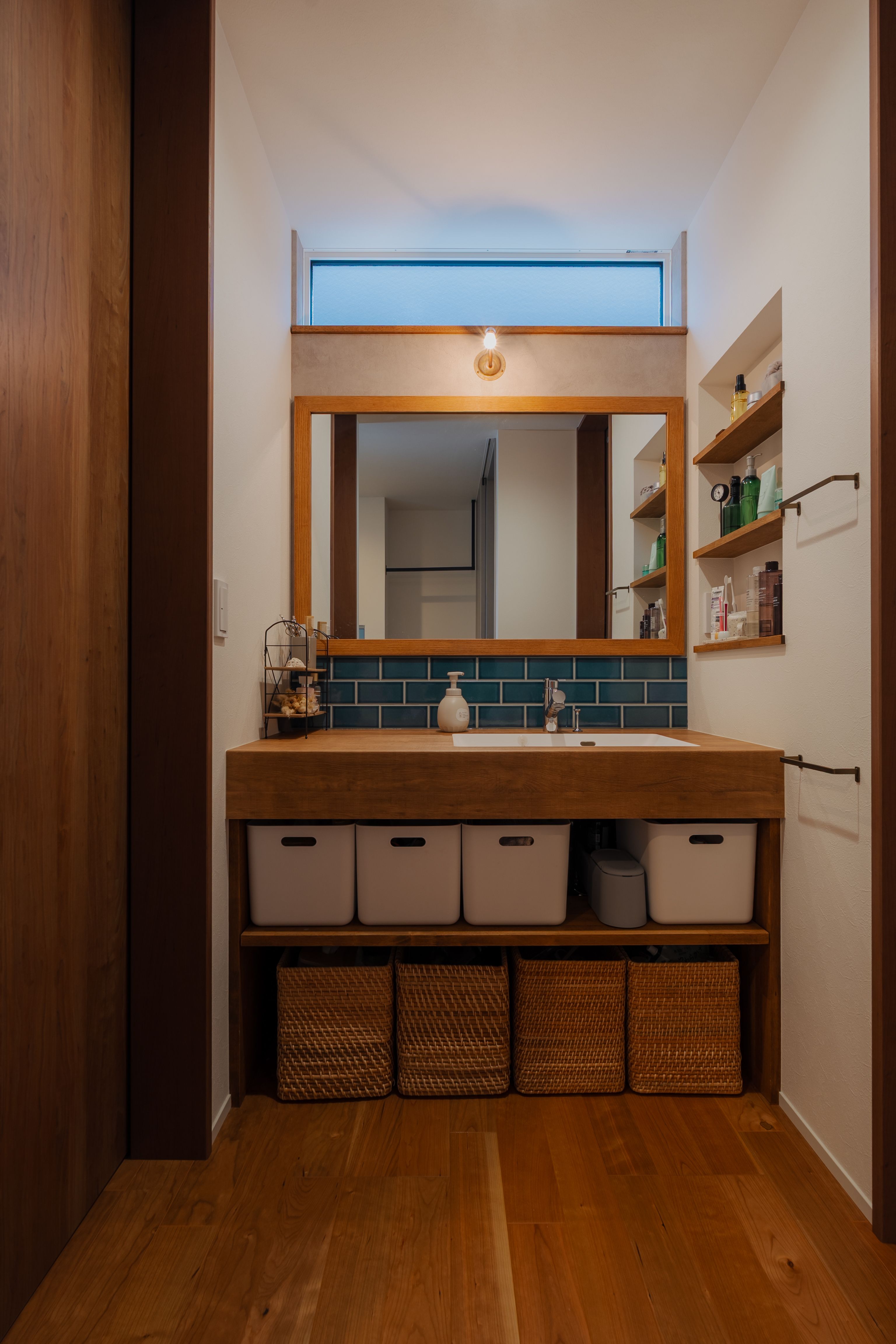木枠ミラーとブルータイルが印象的な造作洗面。
