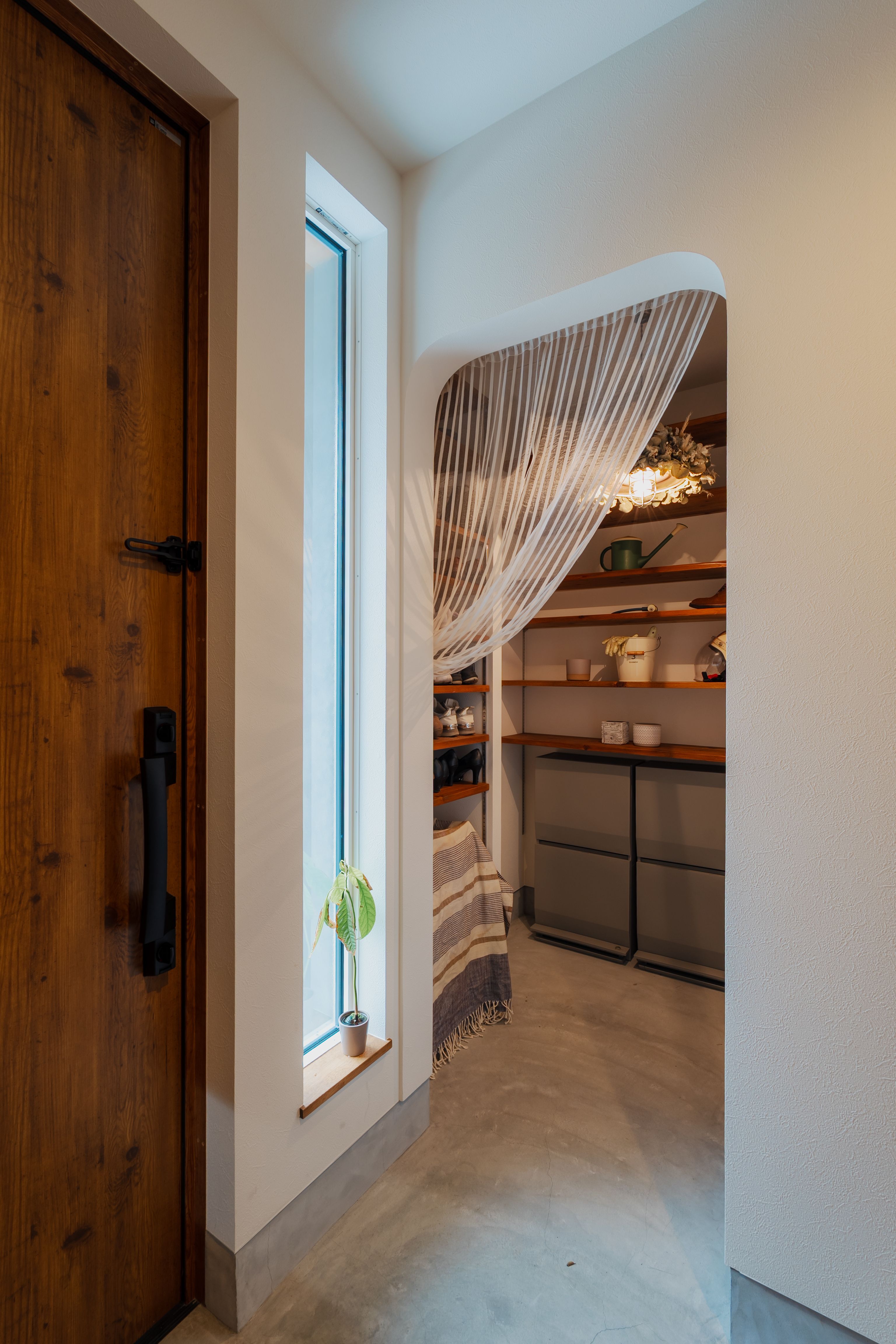 角だけをRにした垂れ壁が、シューズクロークに柔らかな表情を添えます。