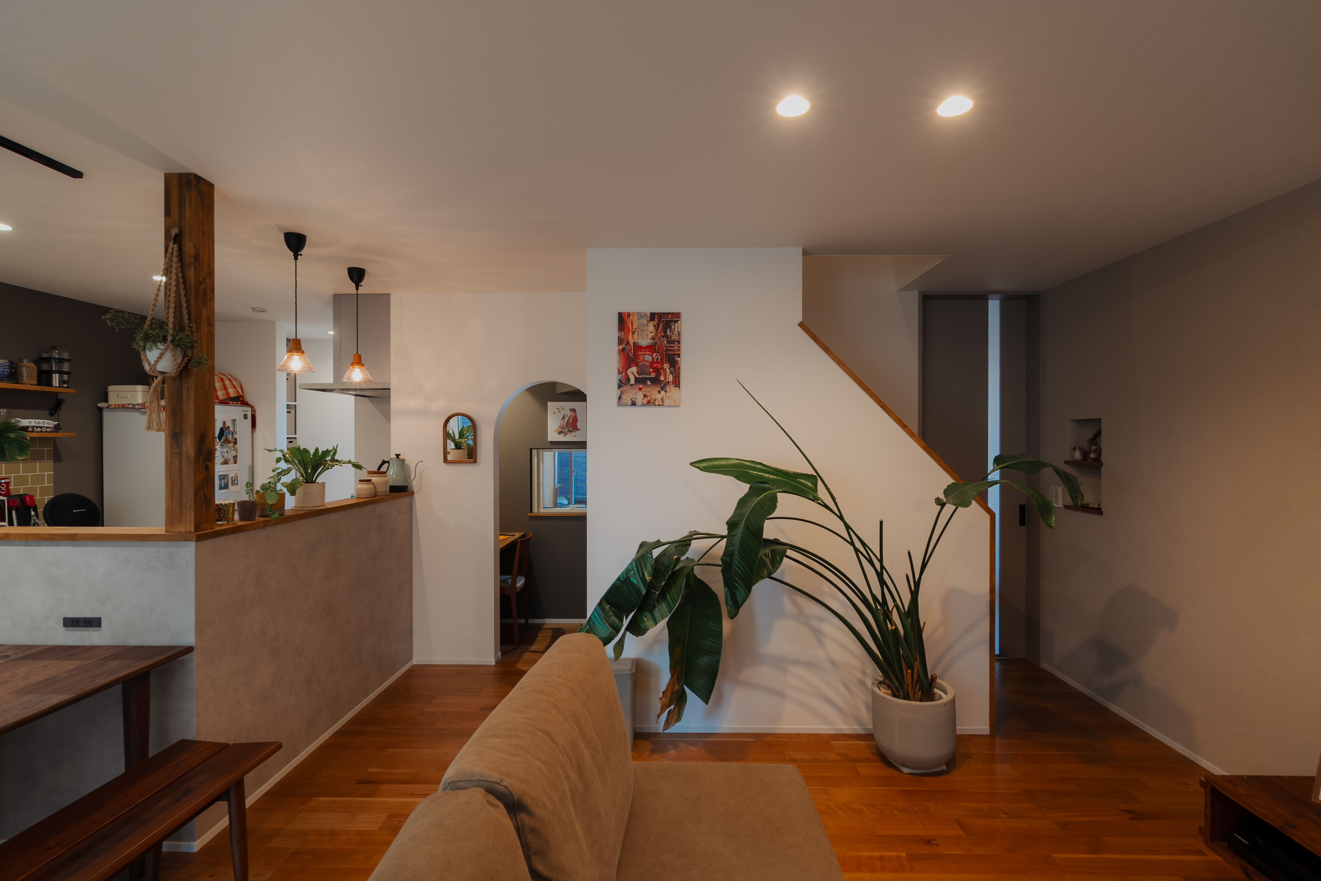 造作の飾り棚にお気に入りやスパイスを並べて、日々の暮らしを彩ります。