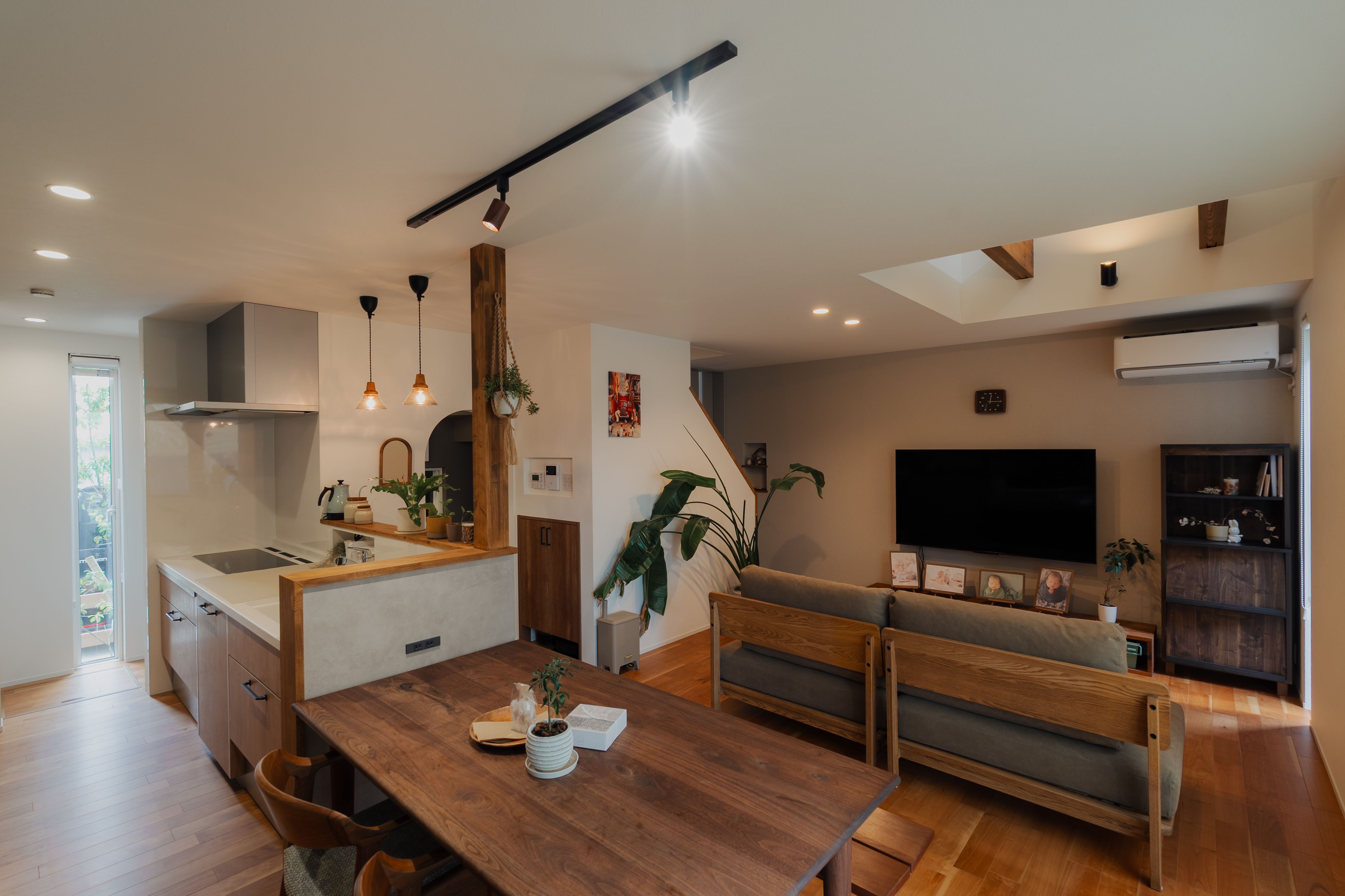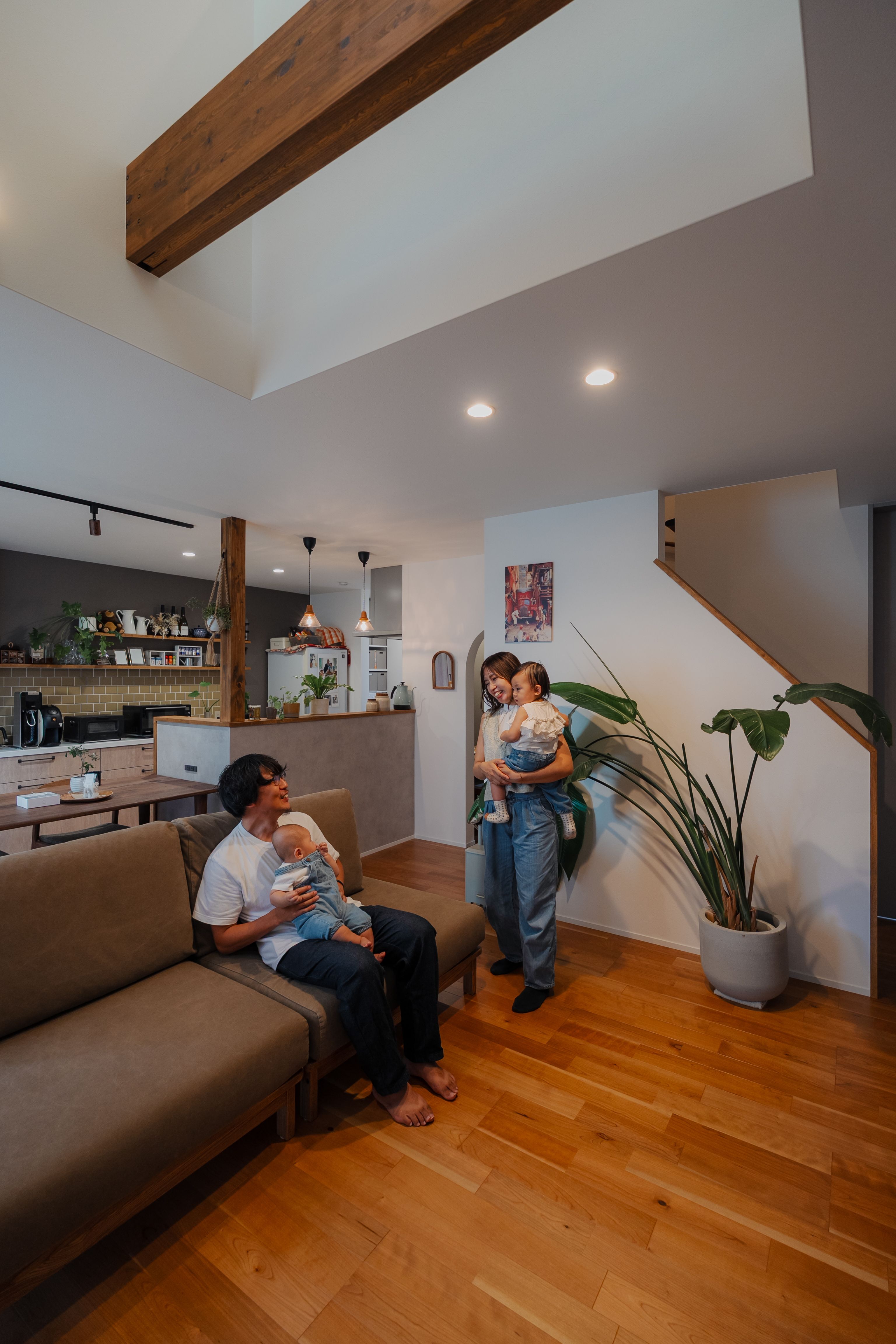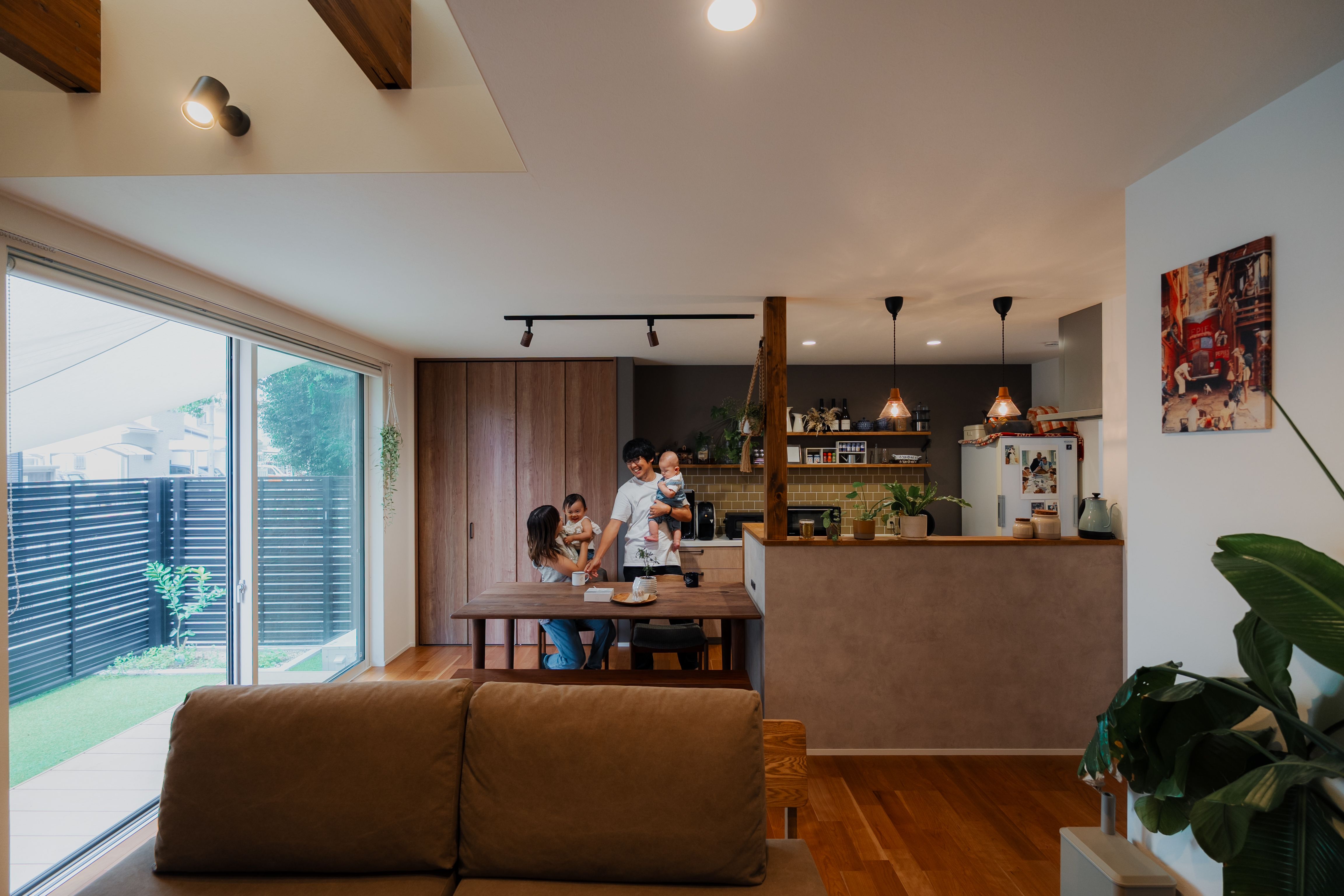 ブラックチェリーの床と木の柱・梁がつくる温もりの空間。