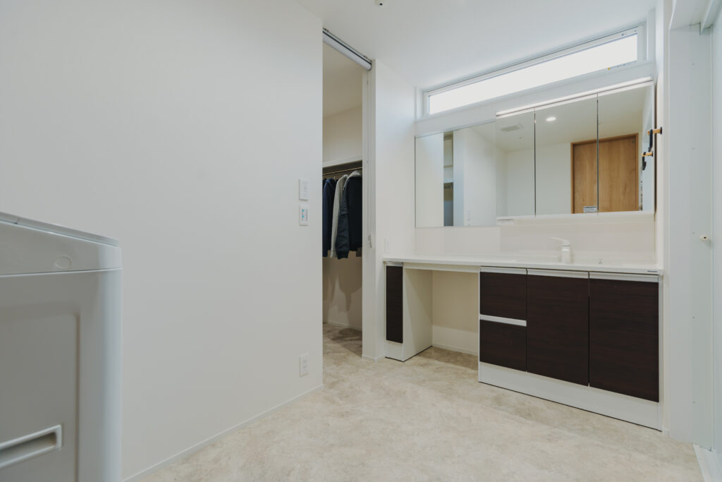 (奥さま)壁紙を換えたりしたお風呂もいいけど、一番は広めの洗面です。もともと旦那さんの方が長く使うので、二人横並びで準備できるのがいい。私は全面鏡張りが良かったのですが、旦那さんは三面鏡じゃないと嫌なので、私用の鏡を別に付けるカタチで落ち着きました。