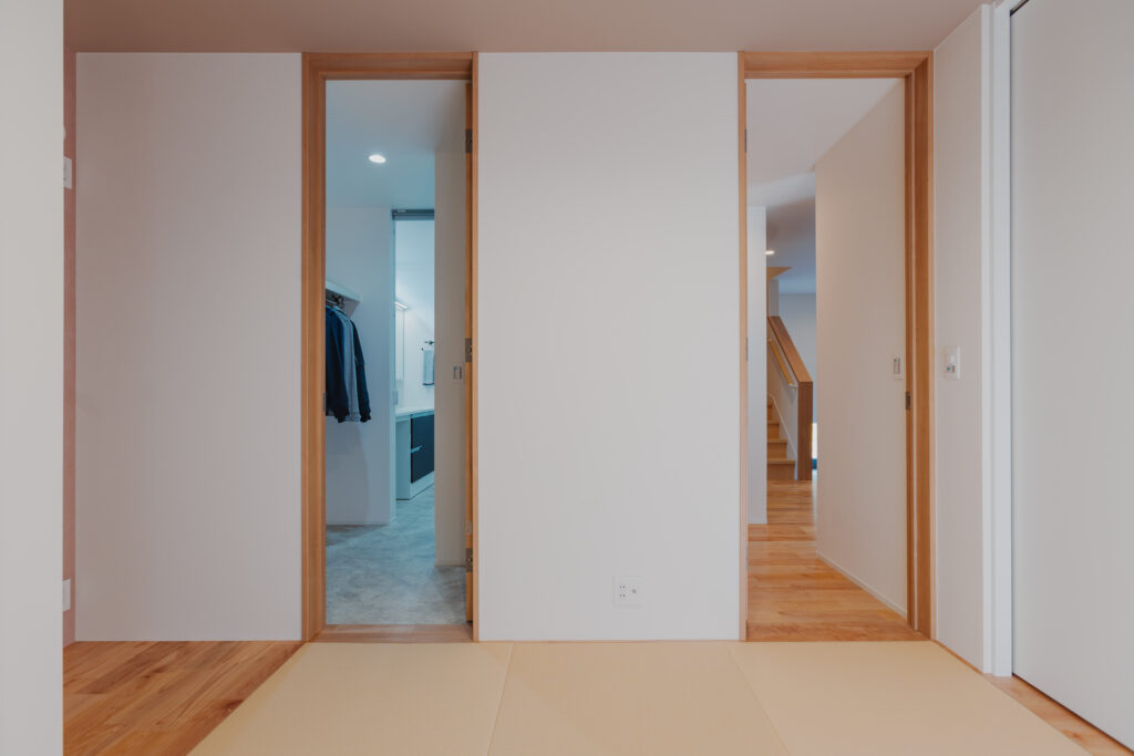 一階にクローゼットがあるといいよと聞いて、洗面横に付けてもらいました。和室からもすぐに行けたりと、あちこちからアクセスできるよう、うちはドアが多め。