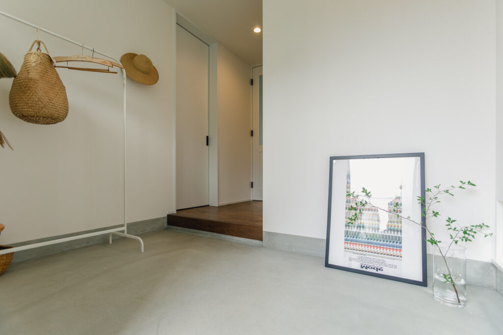(ご主人)玄関が好きですね。子どもが小さいこともあって、思ったより広くて良かったな。マンションの時は暗かったけど、窓を付けてるので明るくて、グレーのモルタル × 白壁の感じが好きですね。ゆっくりできる広いリビングもくつろげます。