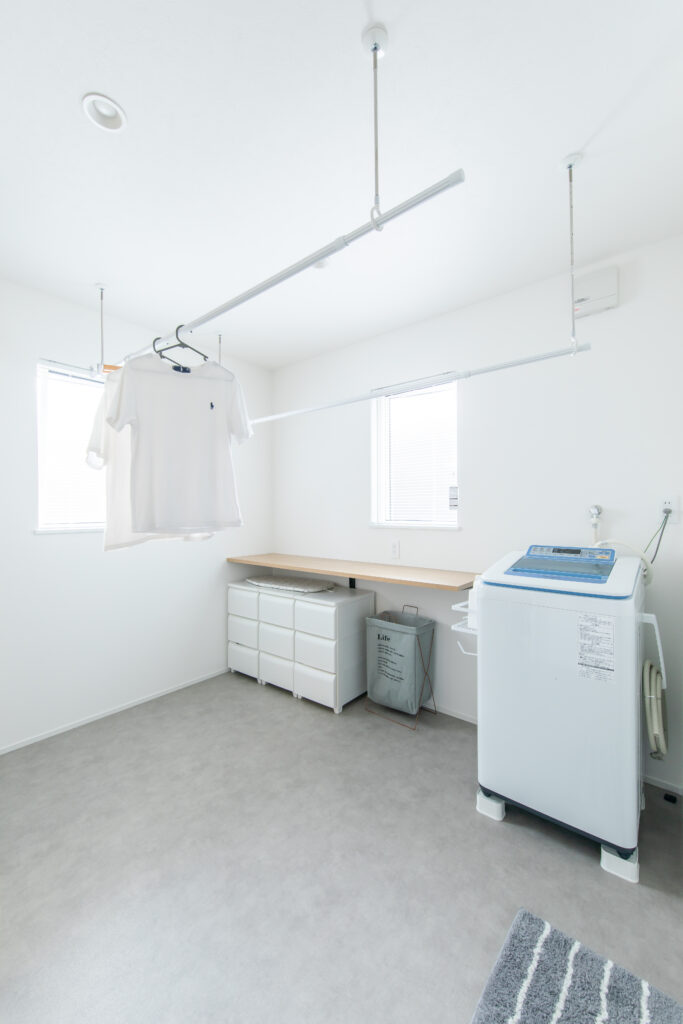 広いランドリールームです。家事ラクな家が第一希望で、極力手間を省きたかった。洗って干して隣のファミリークローゼットにかけるだけが理想で、大正解でした。すごく快適です。
