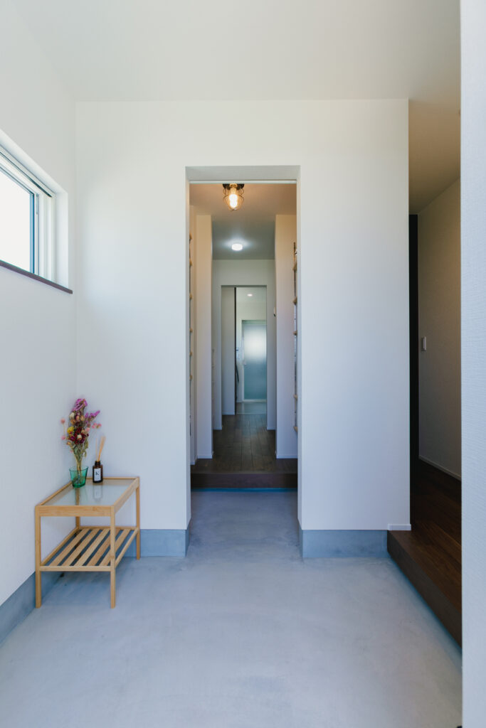 玄関から一直線に続く動線も、コンセプトの一つ。靴を脱いで着替えて手を洗って、そのまま脱衣室からリビングへというのが良くて。お客さんとの通路も分けています。
