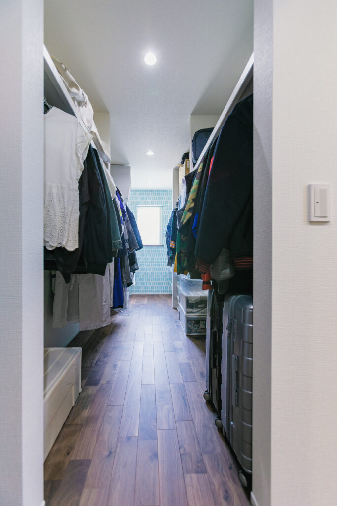 荷物が多いので、収納スペースを広く取りたいというのはありました。2階のウォークインクローゼットは広く長い一列で、設計士さんもこんなに大きな収納は見たことないと。