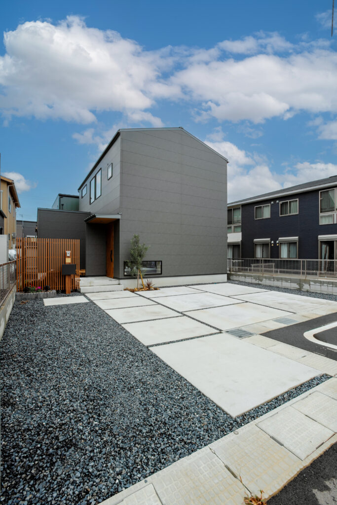 外観は最初の候補がガルバリウムでしたが、雨で汚れを流せるというサイディング材の説明にひかれ、長持ちして機能面とおしゃれどちらもで選びました。最初は黒にしようと思っていましたが、サンプルを見てグレーが映える感じがして、正解でした。触った時のちょっとザラザラした質感が気に入っていて、いつも触ってます(笑)