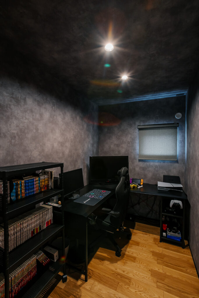 趣味のゲーミングや仕事などができるような、書斎。コンセントの色なども含めて黒系で集中できるように統一して、非常に満足のいくこもれる場所に。ここが出来れば、後はもうという気持ちで(笑)