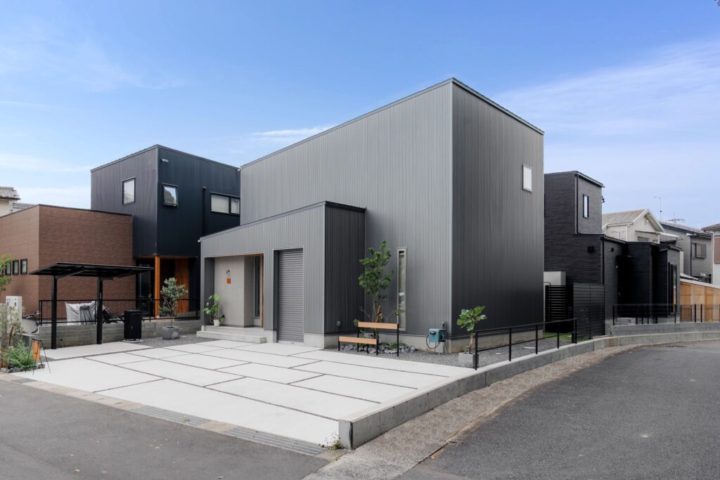 ガルバリウムと同色のグレー塗り壁が、さりげないアクセントに。