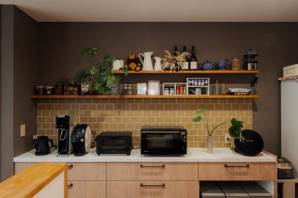 造作の飾り棚にお気に入りやスパイスを並べて、日々の暮らしを彩ります。