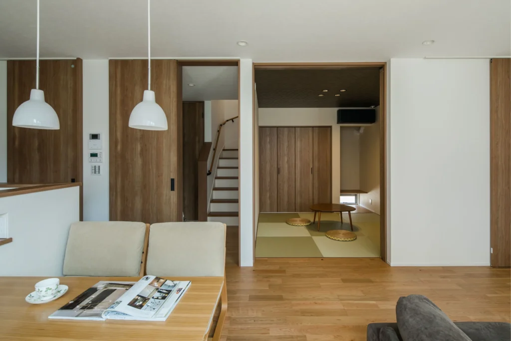 落ち着きと温かみを生むブラックチェリーの床と、大きな窓が印象的なリビングです。