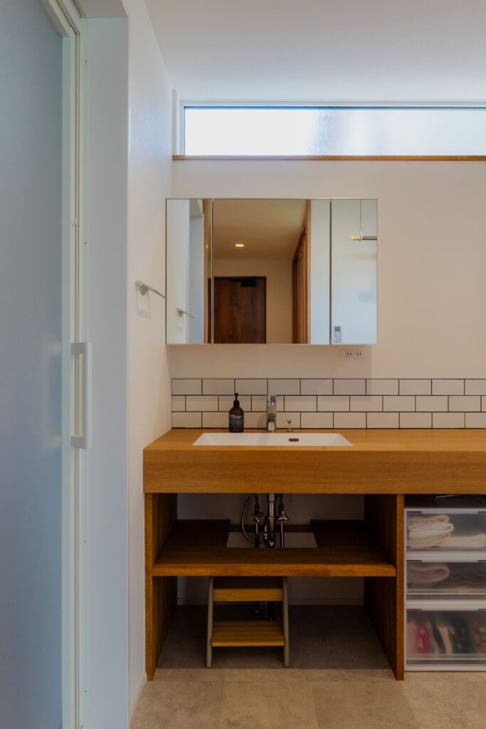 カウンターとボウルの継ぎ目がなく、水返しのタイルも相まって掃除がラクラクな造作洗面台。