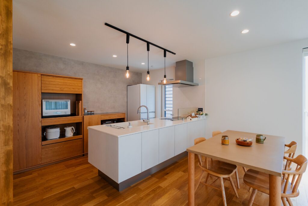 柔らかなグレーのアクセントクロスと照明がなじむダイニングキッチン。
