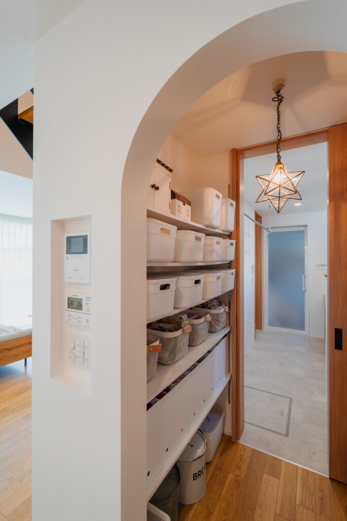 アーチ垂れ壁のパントリーに、ストック品をまとめて。スイッチニッチも便利に活用。