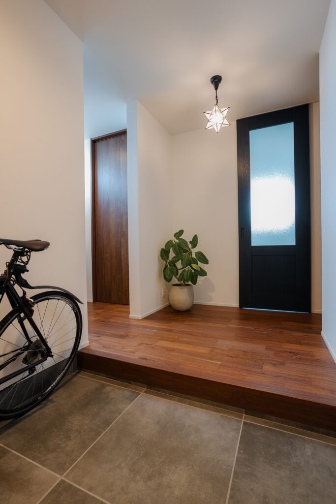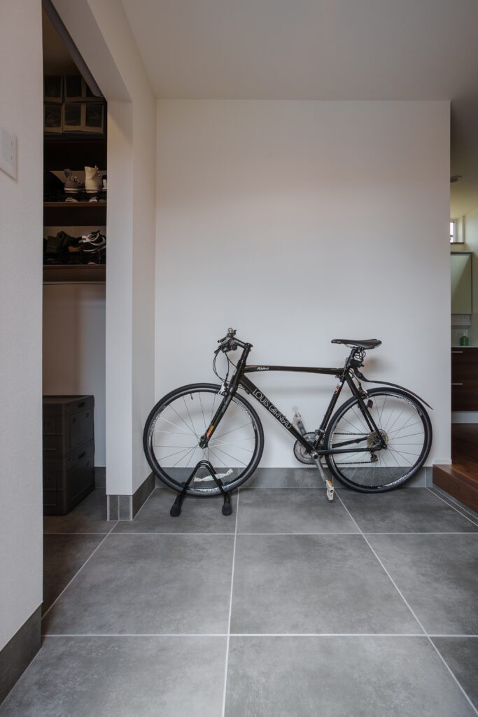 趣味の自転車を置くスペースを確保した玄関に、汚れが目立ちにくいグレーの600角タイルをチョイス。