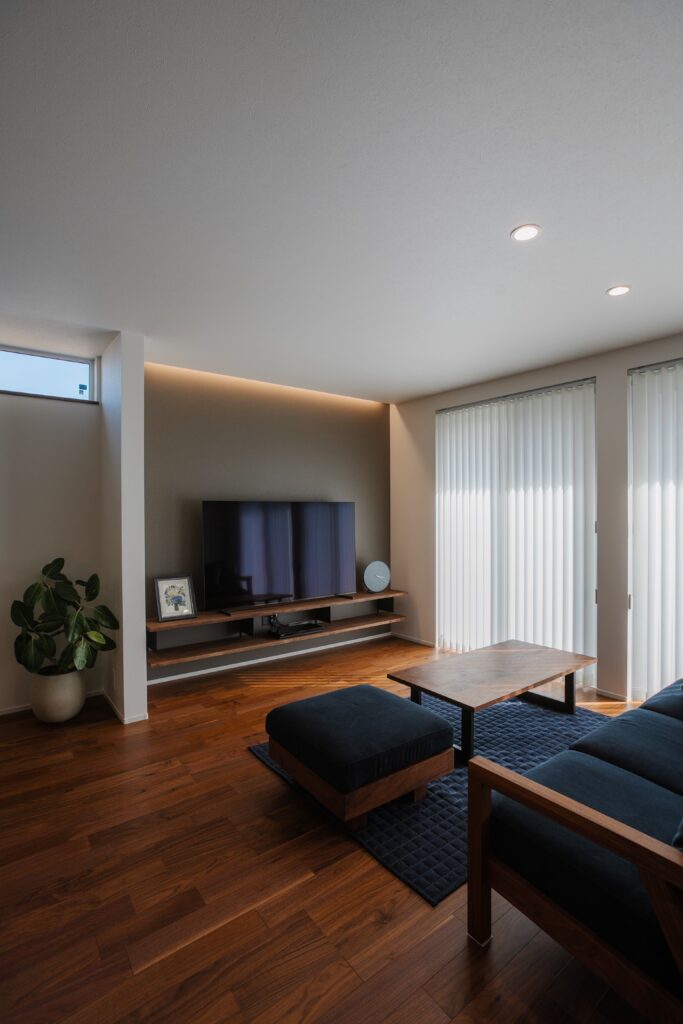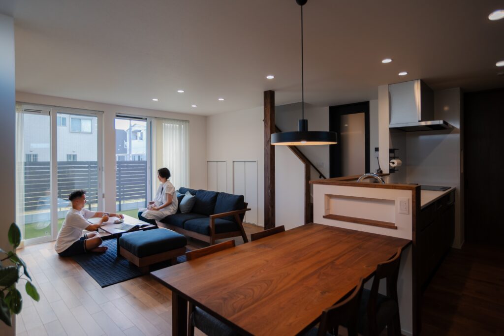 大きな窓から届く日差しや間接照明の温もりが、家族の時間を豊かにします。