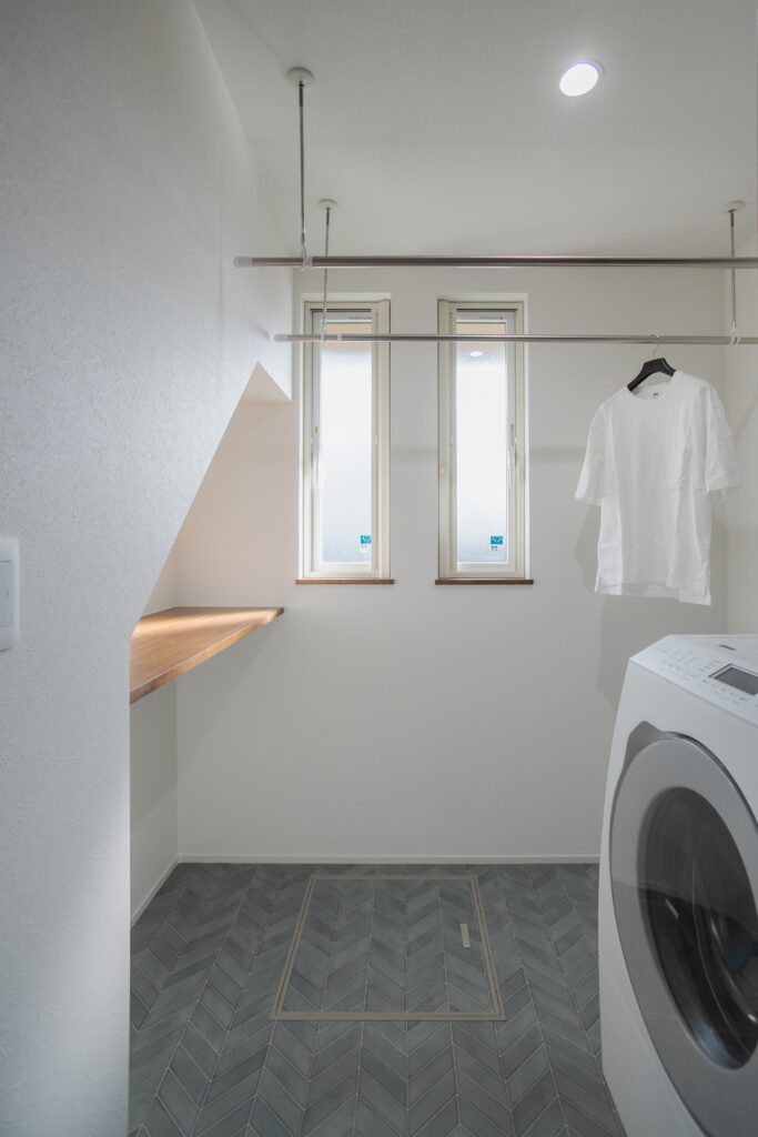 階段下を利用して、畳んだりアイロンしたりが便利なカウンターを造作。