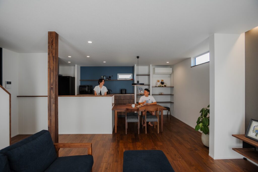 ブラックウォルナットの落ち着きや、化粧柱のアクセントが心地よく調和するLDK。