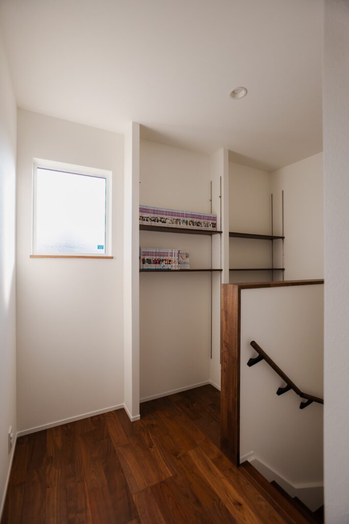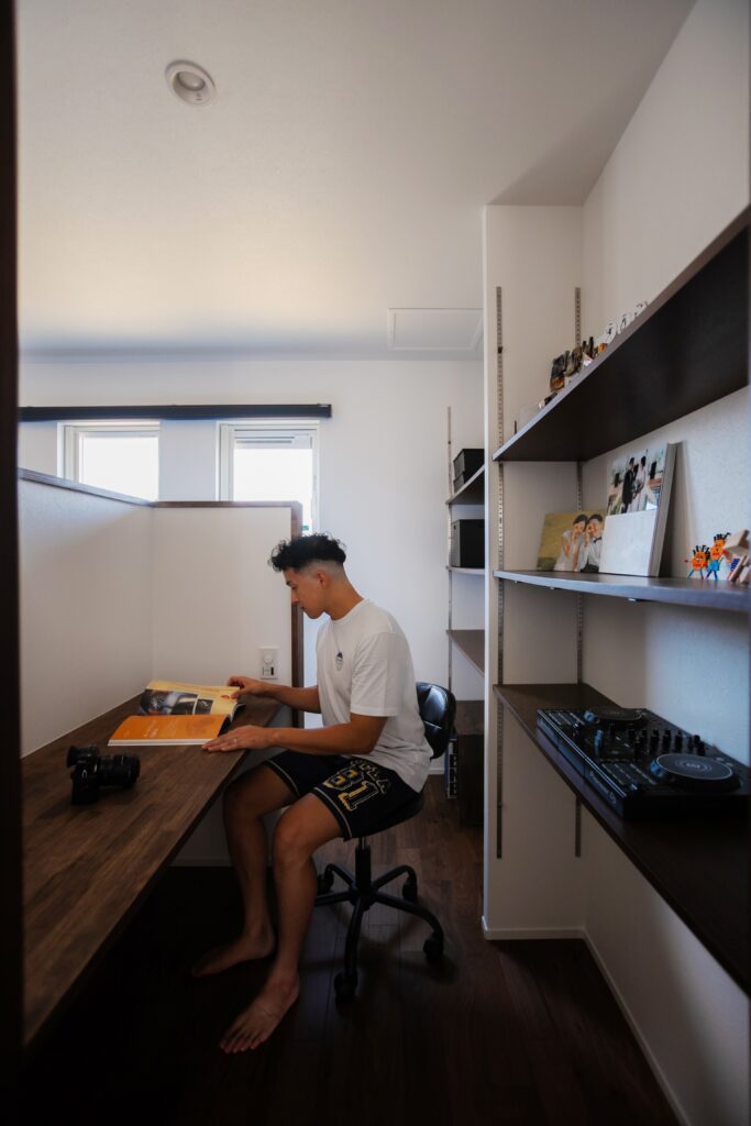 造作カウンターと背面の収納で、使い勝手のいい書斎。
