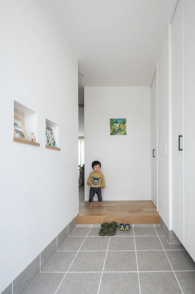 雰囲気のあるタイルが調和するフラットな造作洗面カウンターは、玄関やリビングからのアクセスも良好。