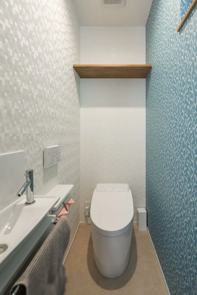 オークの床と淡いブルーのアクセントクロスを合わせた、やわらさが心地よいリビング。