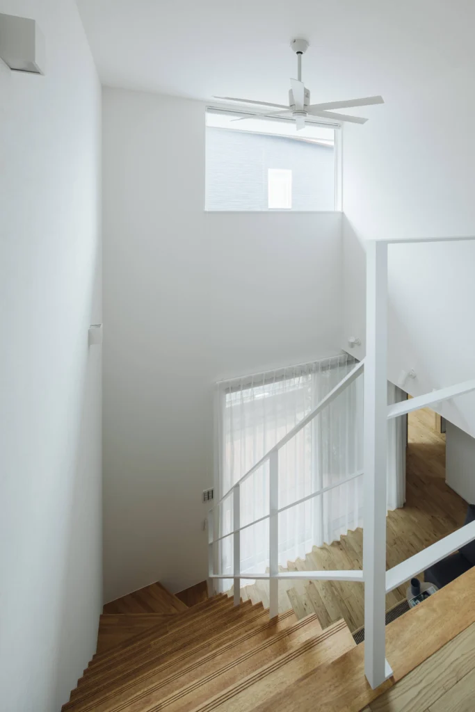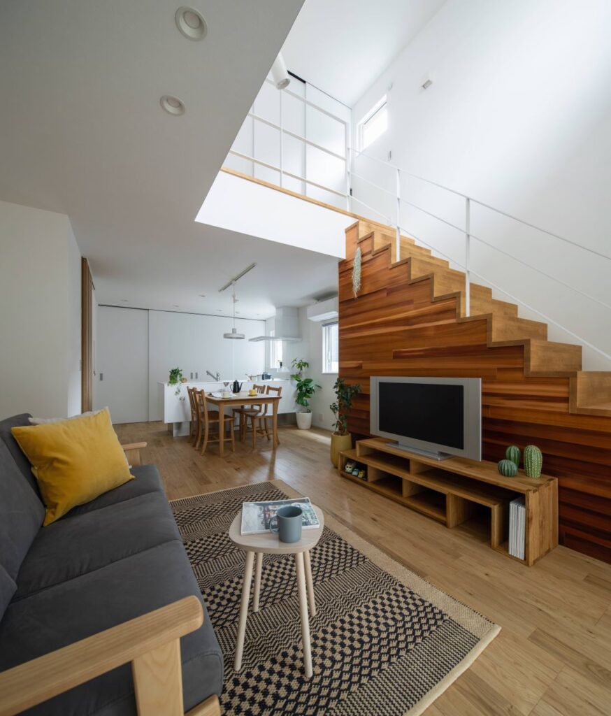 レッドシダー板張り×アイアン手摺りが美しい吹き抜け空間。