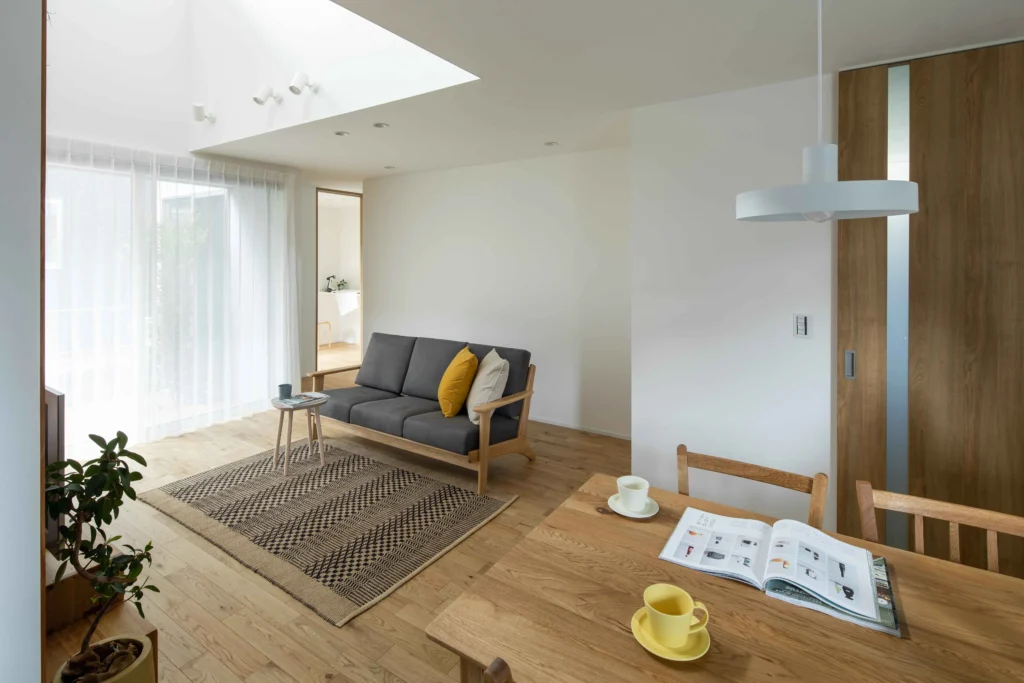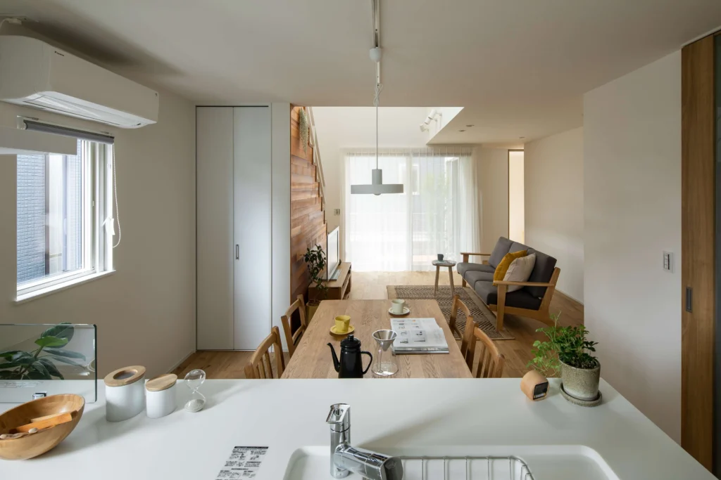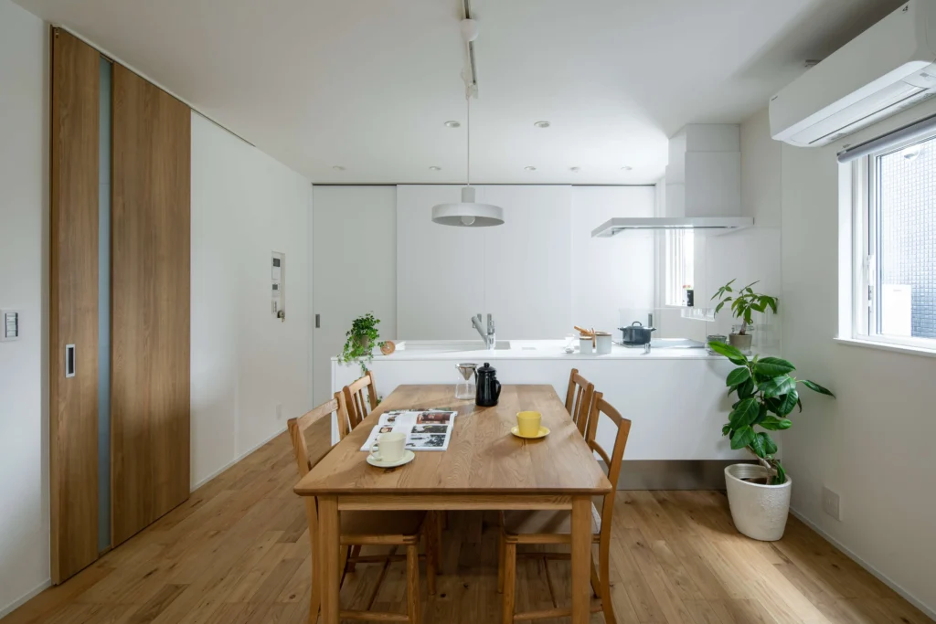 冷蔵庫も隠す扉付きの背面収納で、生活感を完全に消した居心地のいいダイニングキッチン。