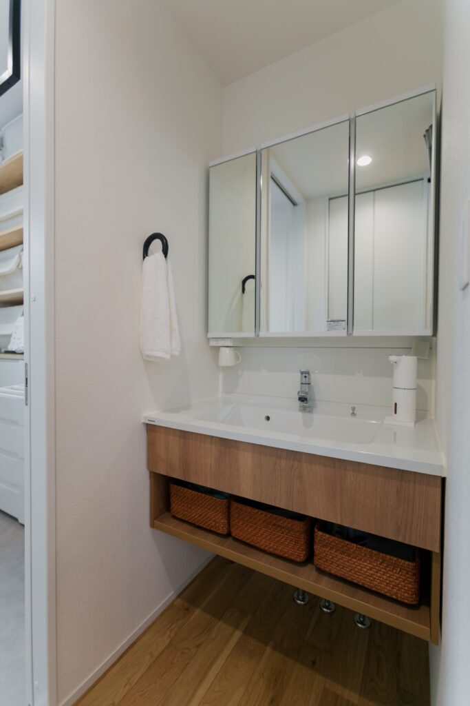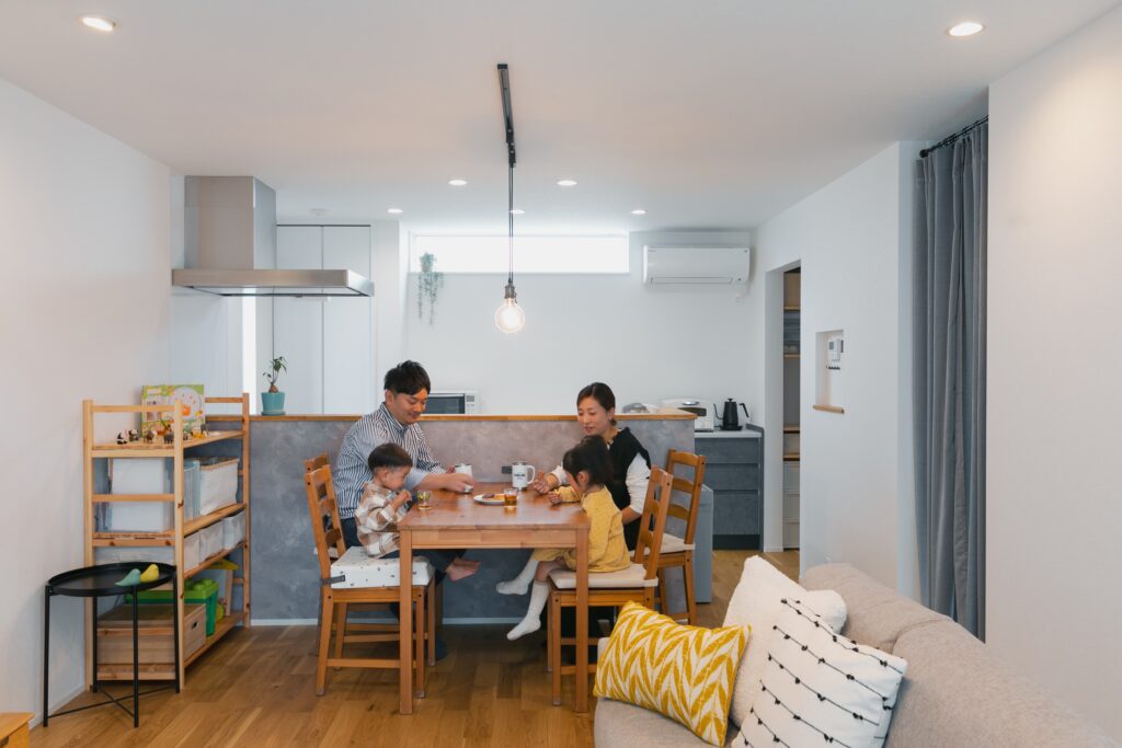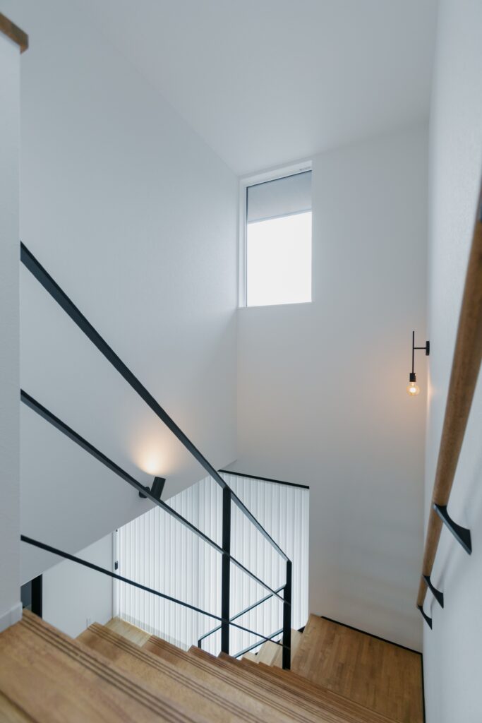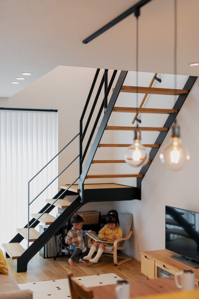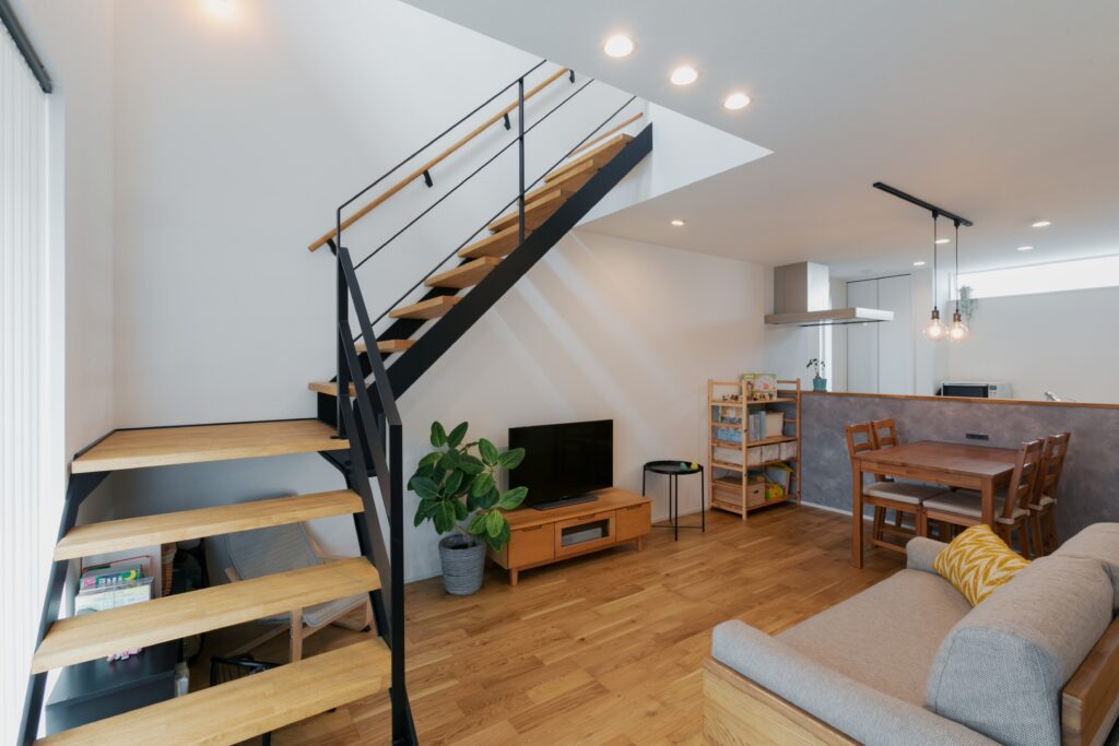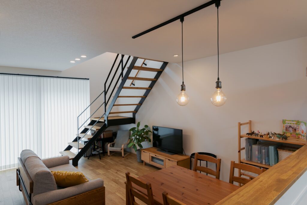 24坪のコンパクトさを、吹き抜けや鉄骨階段で圧迫感をカバーする工夫に満ちた空間。