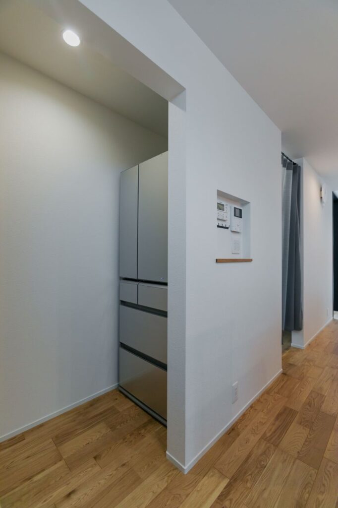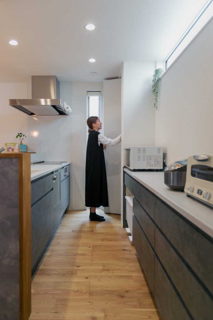 冷蔵庫を隠すことで、収納スペースが増え生活感もオフしたキッチン。