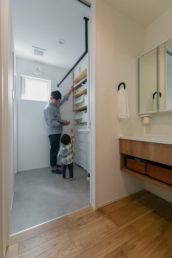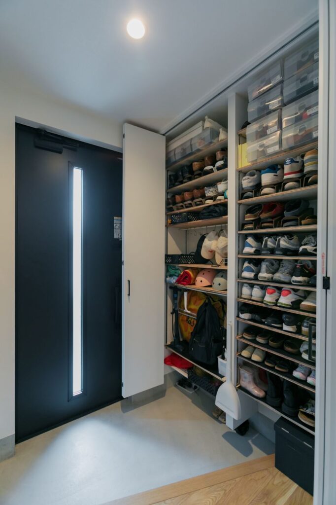 モルタル仕上げに、たっぷり収納のシューズクロークを設けた玄関です。