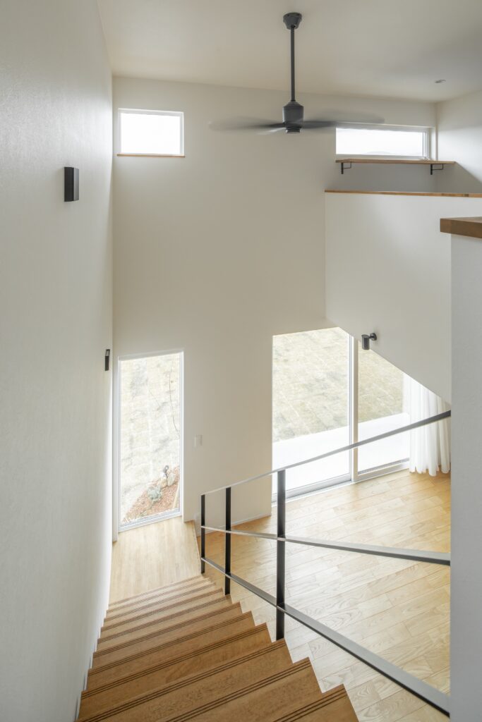 吹き抜けとアイアン手摺りの相乗効果で、抜け感がアップ。
