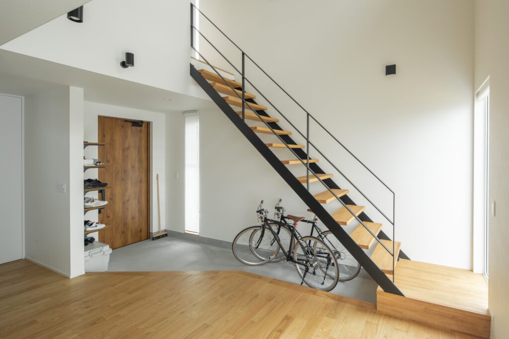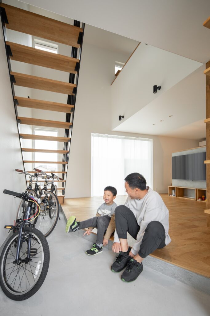 斜めにカットして広がりの出た玄関框に座ってお出掛け準備をしたり、自転車を置いたり、使い勝手のいい土間です。