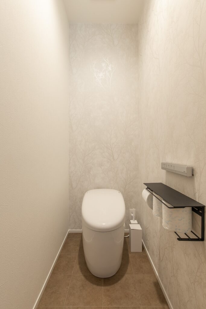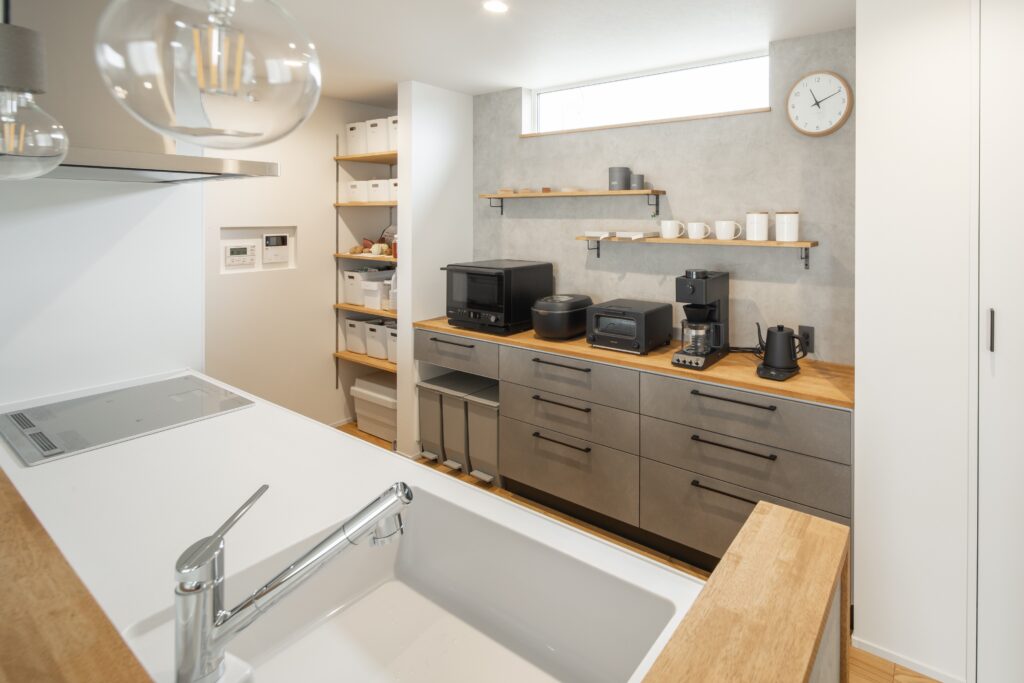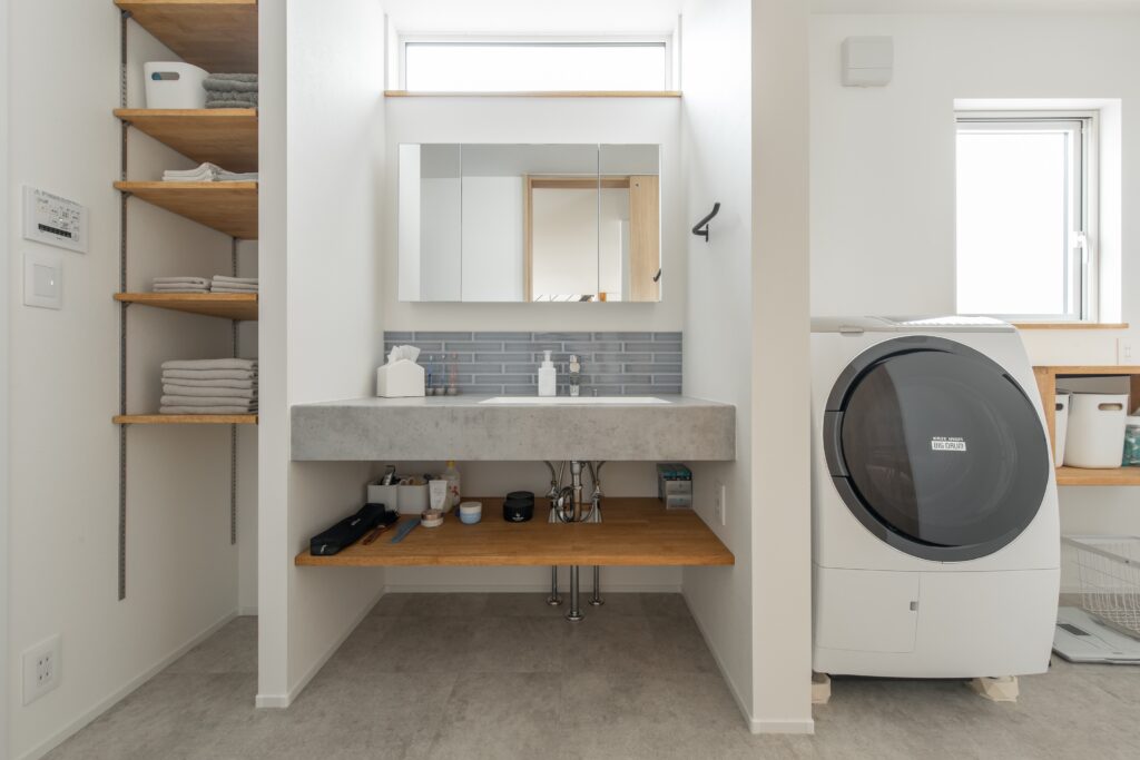 タイルがアクセントになった、グレートーンの造作洗面カウンター。