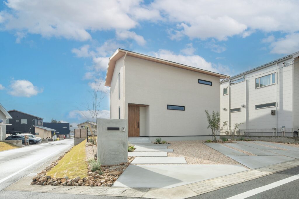 閑静な住宅街に、淡いベージュの塗り壁が溶け込む外観。