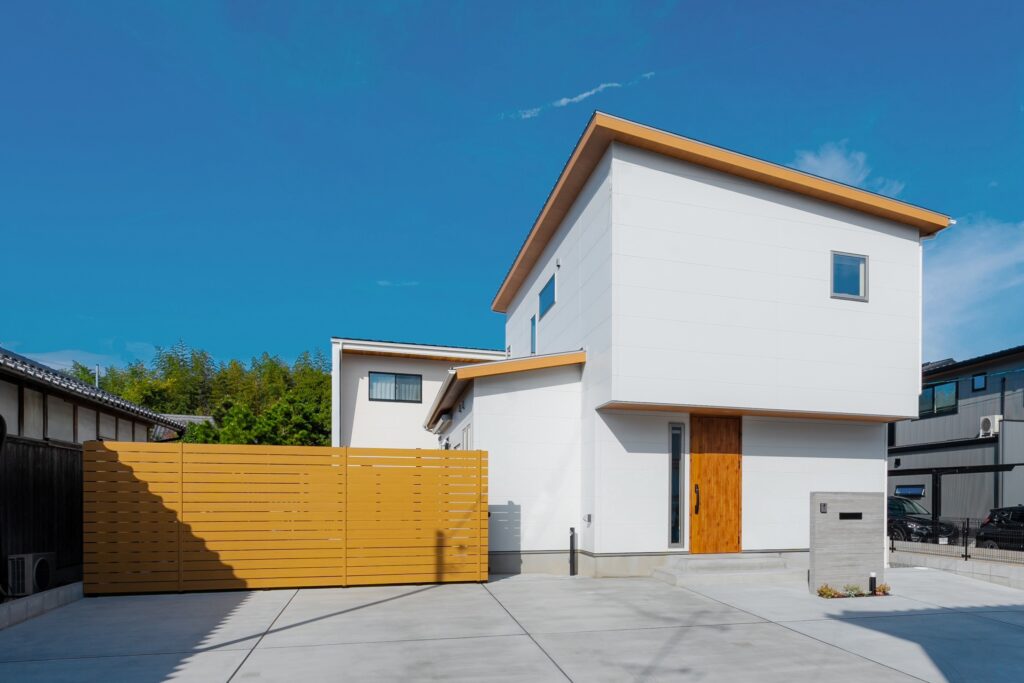 緩やかな片流れ屋根とオーバーハングに、窓がアクセントになった外観。