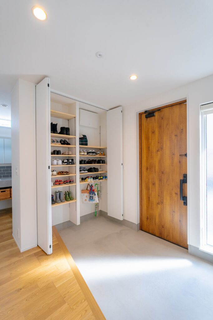 両サイドにオープンな日常使いのものを置くスペースと、扉を付けたシューズクロークですっきりもキープ。