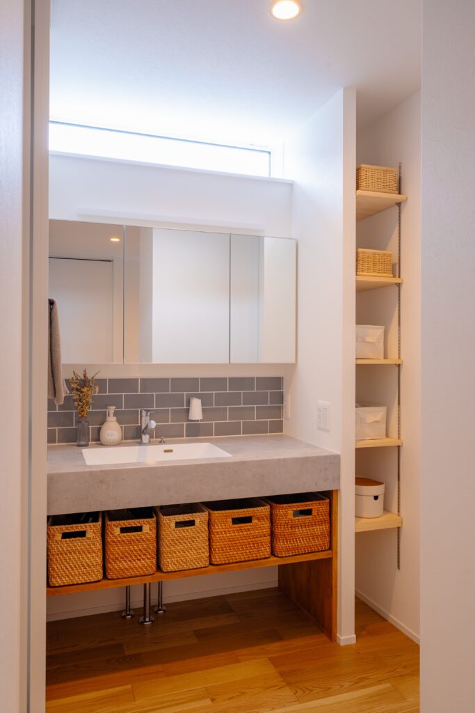 グレーのタイルとフラットなカウンターで、おしゃれな造作洗面。