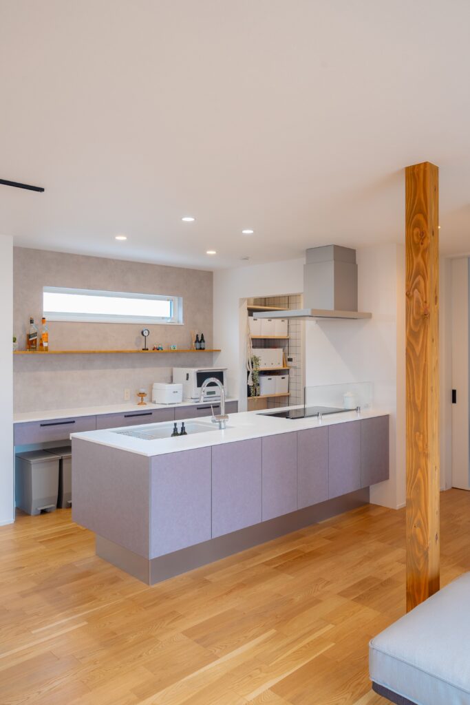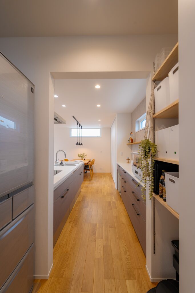 冷蔵庫や日用品は、隣のパントリーに収納し生活感をオフ。