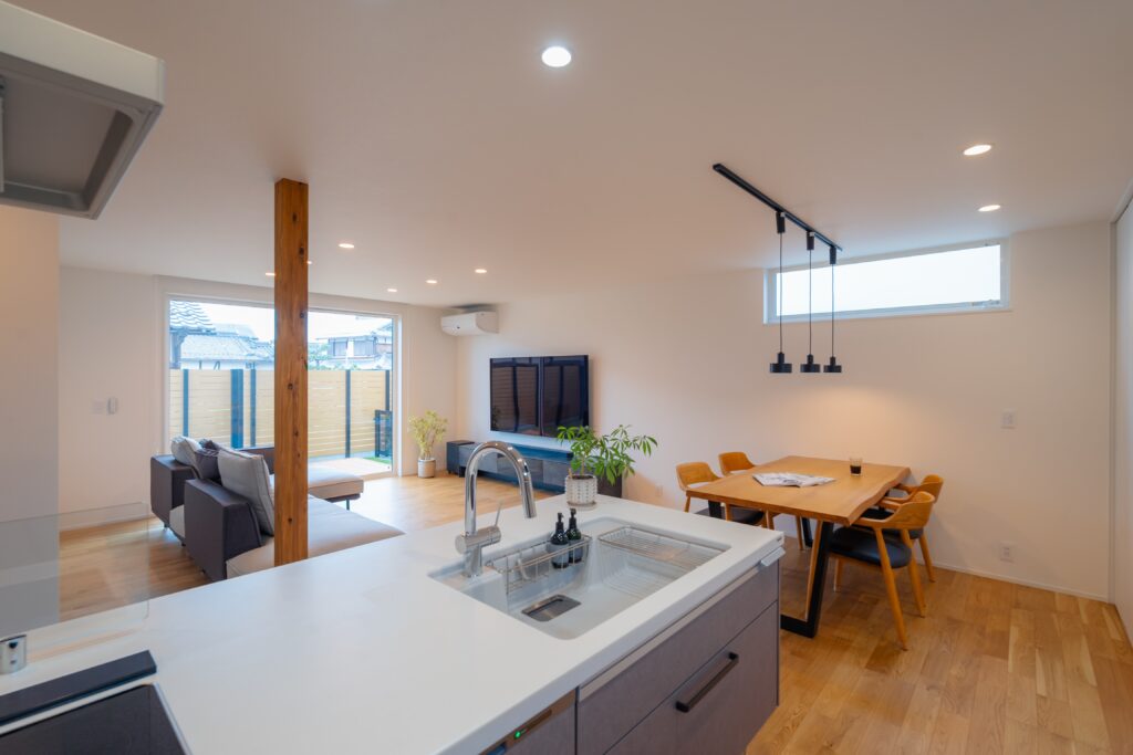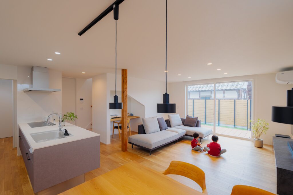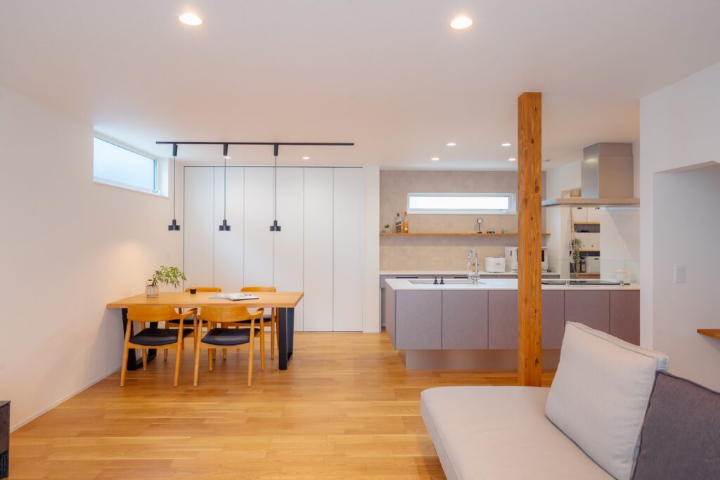白×グレー×木のまとまりと、心地よさが調和するLDK。中庭まで広がる大空間で、化粧柱が程よいアクセントに。