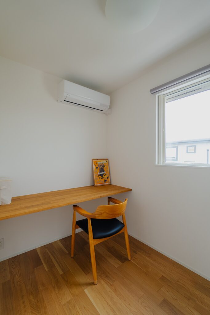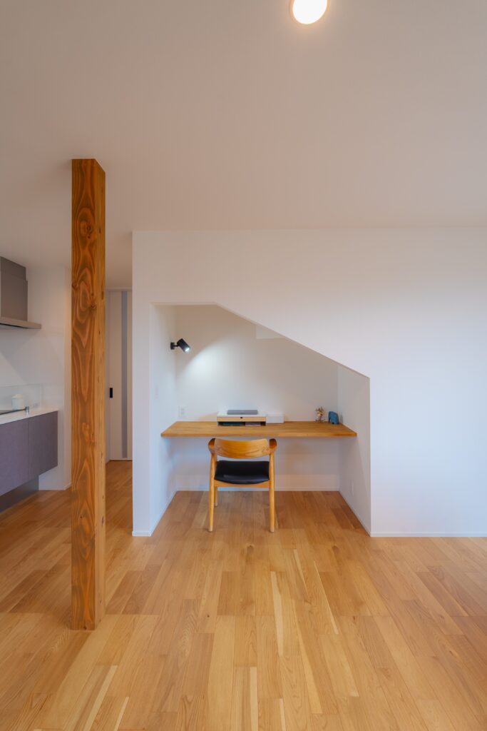 リビング中央に階段下を有効活用した、こもり感ある奥行きのスタディコーナー。