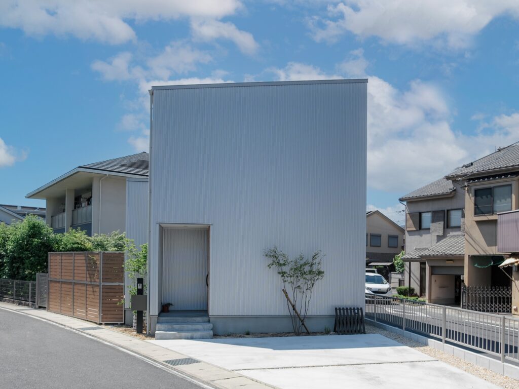シルバーのガルバリウム × ボックスに、シンボルツリーが彩りを添える外観。