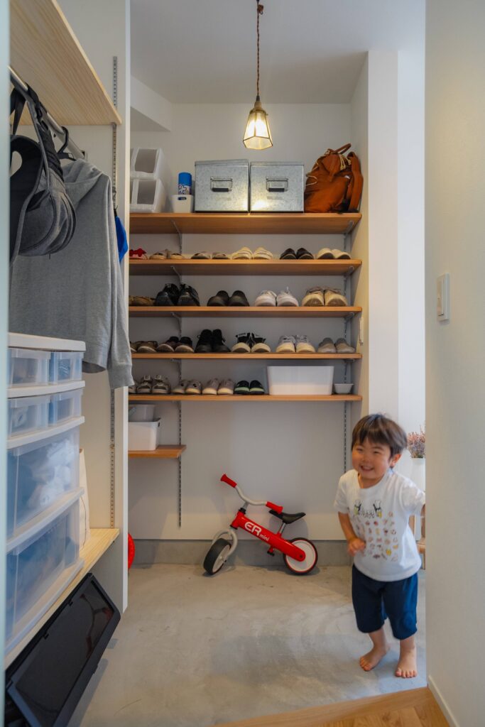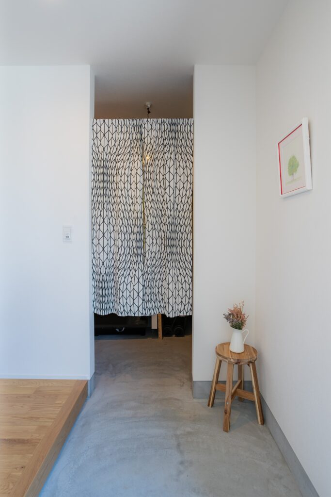 通常の出入り口とシューズクローク側とを分けた、モルタル仕上げのゆったり2WAY玄関。