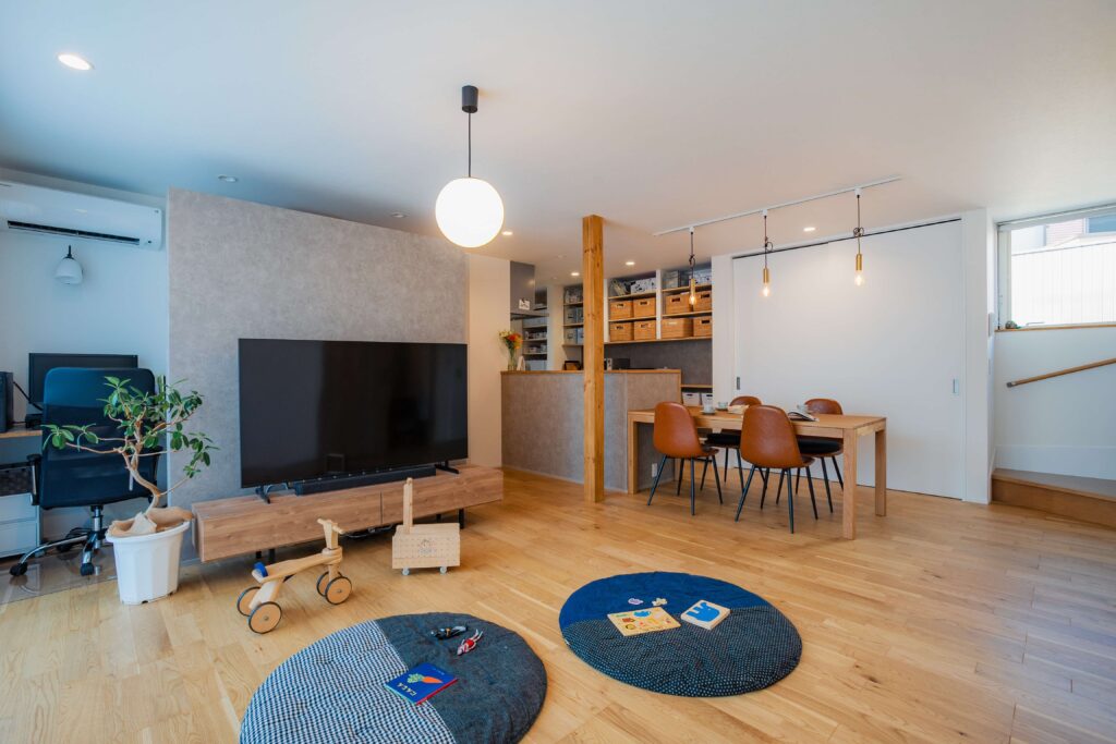 テレビ後方に造作PCカウンターと収納スペースを設け、空間を有効に使います。