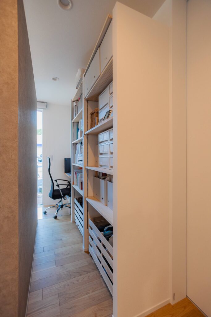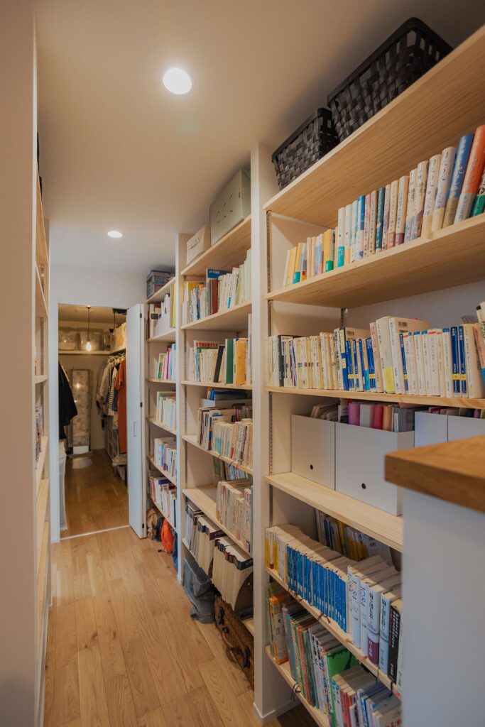 2階ホールに、家族の本棚と直線で連なるファミリークローゼットを計画。