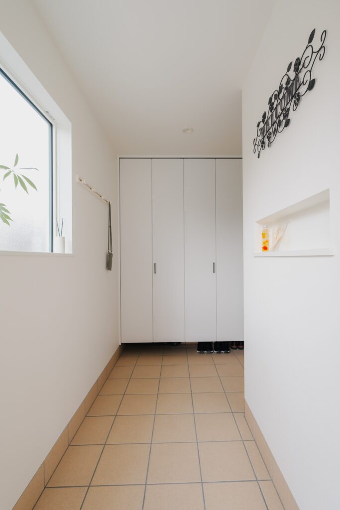 温かみある色合いのタイル玄関。通路には光を取り込む窓と、小物を置けるニッチを造作しました。