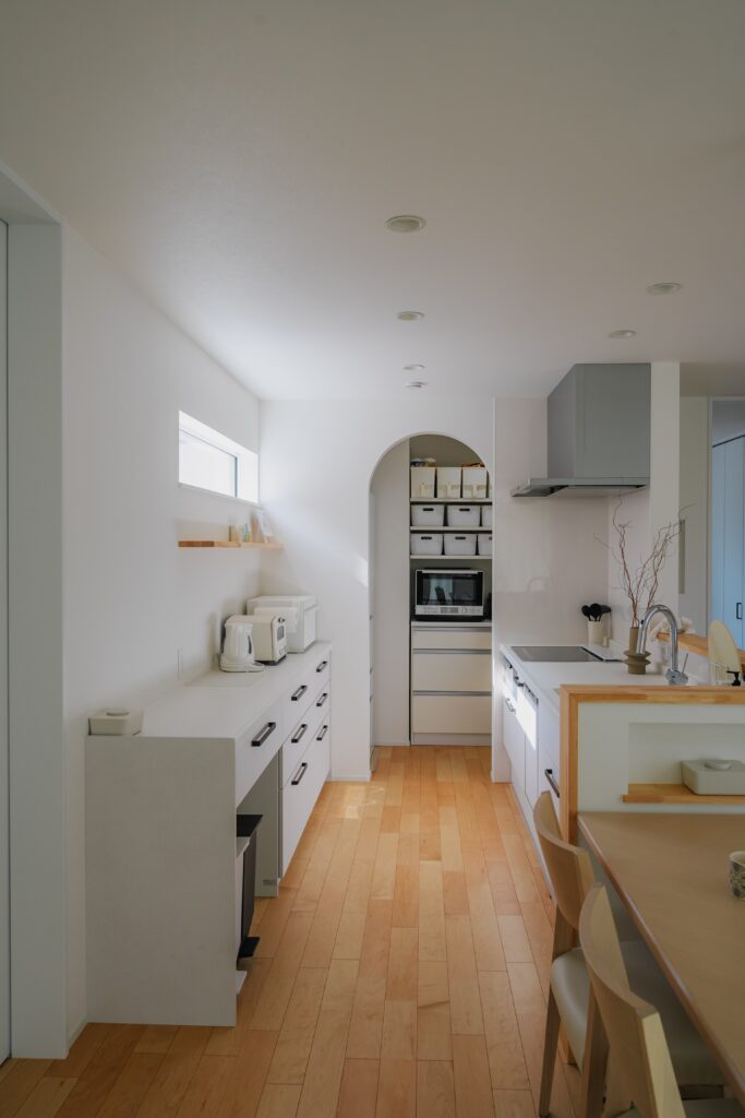 大人可愛いアーチ垂れ壁のパントリーに、冷蔵庫や日用品を置き生活感をオフ。