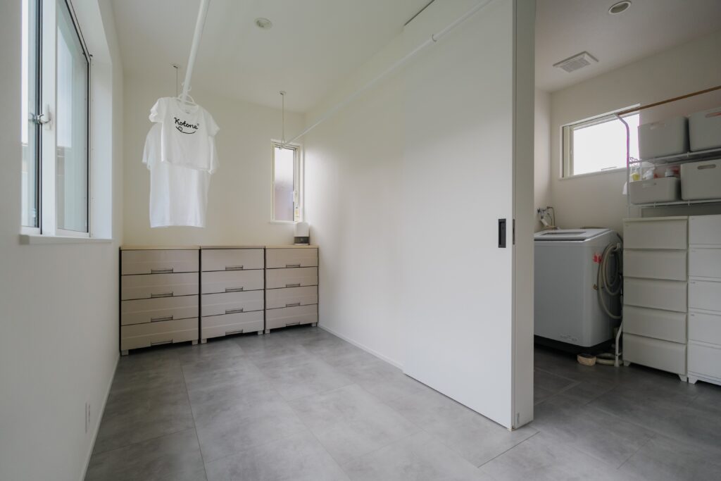 隣り合わせのランドリーとで、洗う干すしまうまでを完結させます。